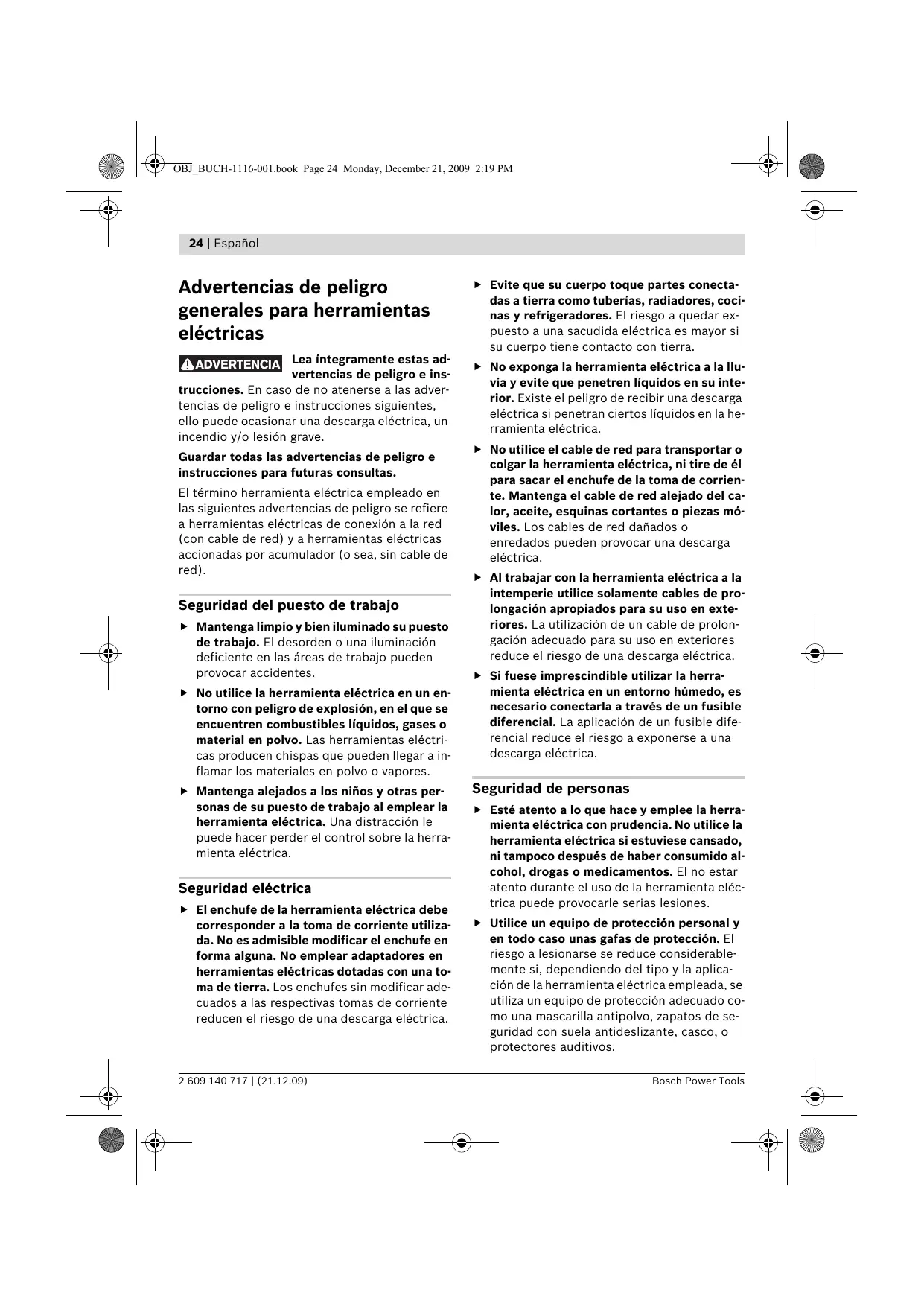 ADVERTENCIA Lea íntegramente estas advertencias de peligro e instrucciones. En caso de no atenerse a las advertencias de peligro e instrucciones siguientes, ello puede ocasionar una descarga eléctrica, un incendio y/o lesión grave. Guardar todas las advertencias de peligro e instrucciones para futuras consultas. El término herramienta eléctrica empleado en las siguientes advertencias de peligro se refiere a herramientas eléctricas de conexión a la red (con cable de red) y a herramientas eléctricas accionadas por acumulador (o sea, sin cable de red). Seguridad del puesto de trabajo f Mantenga limpio y bien iluminado su puesto de trabajo. El desorden o una iluminación deficiente en las áreas de trabajo pueden provocar accidentes. f No utilice la herramienta eléctrica en un entorno con peligro de explosión, en el que se encuentren combustibles líquidos, gases o material en polvo. Las herramientas eléctricas producen chispas que pueden llegar a inflamar los materiales en polvo o vapores. f Mantenga alejados a los niños y otras personas de su puesto de trabajo al emplear la herramienta eléctrica. Una distracción le puede hacer perder el control sobre la herramienta eléctrica. Seguridad eléctrica f El enchufe de la herramienta eléctrica debe corresponder a la toma de corriente utilizada. No es admisible modificar el enchufe en forma alguna. No emplear adaptadores en herramientas eléctricas dotadas con una toma de tierra. Los enchufes sin modificar adecuados a las respectivas tomas de corriente reducen el riesgo de una descarga eléctrica. 2 609 140 717 | (21.12.09) f Evite que su cuerpo toque partes conectadas a tierra como tuberías, radiadores, cocinas y refrigeradores. El riesgo a quedar expuesto a una sacudida eléctrica es mayor si su cuerpo tiene contacto con tierra. f No exponga la herramienta eléctrica a la lluvia y evite que penetren líquidos en su interior. Existe el peligro de recibir una descarga eléctrica si penetran ciertos líquidos en la herramienta eléctrica. f No utilice el cable de red para transportar o colgar la herramienta eléctrica, ni tire de él para sacar el enchufe de la toma de corriente. Mantenga el cable de red alejado del calor, aceite, esquinas cortantes o piezas móviles. Los cables de red dañados o enredados pueden provocar una descarga eléctrica. f Al trabajar con la herramienta eléctrica a la intemperie utilice solamente cables de prolongación apropiados para su uso en exteriores. La utilización de un cable de prolongación adecuado para su uso en exteriores reduce el riesgo de una descarga eléctrica. f Si fuese imprescindible utilizar la herramienta eléctrica en un entorno húmedo, es necesario conectarla a través de un fusible diferencial. La aplicación de un fusible diferencial reduce el riesgo a exponerse a una descarga eléctrica. Seguridad de personas f Esté atento a lo que hace y emplee la herramienta eléctrica con prudencia. No utilice la herramienta eléctrica si estuviese cansado, ni tampoco después de haber consumido alcohol, drogas o medicamentos. El no estar atento durante el uso de la herramienta eléctrica puede provocarle serias lesiones. f Utilice un equipo de protección personal y en todo caso unas gafas de protección. El riesgo a lesionarse se reduce considerablemente si, dependiendo del tipo y la aplicación de la herramienta eléctrica empleada, se utiliza un equipo de protección adecuado como una mascarilla antipolvo, zapatos de seguridad con suela antideslizante, casco, o protectores auditivos. Bosch Power Tools Español | 25 f Evite una puesta en marcha fortuita. Asegurarse de que la herramienta eléctrica esté desconectada antes de conectarla a la toma de corriente y/o al montar el acumulador, al recogerla, y al transportarla. Si transporta la herramienta eléctrica sujetándola por el interruptor de conexión/desconexión, o si alimenta la herramienta eléctrica estando ésta conectada, ello puede dar lugar a un accidente. f Retire las herramientas de ajuste o llaves fijas antes de conectar la herramienta eléctrica. Una herramienta de ajuste o llave fija colocada en una pieza rotante puede producir lesiones al poner a funcionar la herramienta eléctrica. f Evite posturas arriesgadas. Trabaje sobre una base firme y mantenga el equilibrio en todo momento. Ello le permitirá controlar mejor la herramienta eléctrica en caso de presentarse una situación inesperada. f Lleve puesta una vestimenta de trabajo adecuada. No utilice vestimenta amplia ni joyas. Mantenga su pelo, vestimenta y guantes alejados de las piezas móviles. La vestimenta suelta, el pelo largo y las joyas se pueden enganchar con las piezas en movimiento. f Siempre que sea posible utilizar unos equipos de aspiración o captación de polvo, asegúrese que éstos estén montados y que sean utilizados correctamente. El empleo de estos equipos reduce los riesgos derivados del polvo. Uso y trato cuidadoso de herramientas eléctricas f No sobrecargue la herramienta eléctrica. Use la herramienta eléctrica prevista para el trabajo a realizar. Con la herramienta adecuada podrá trabajar mejor y más seguro dentro del margen de potencia indicado. f No utilice herramientas eléctricas con un interruptor defectuoso. Las herramientas eléctricas que no se puedan conectar o desconectar son peligrosas y deben hacerse reparar. f Saque el enchufe de la red y/o desmonte el acumulador antes de realizar un ajuste en la herramienta eléctrica, cambiar de accesorio o al guardar la herramienta eléctrica. Esta medida preventiva reduce el riesgo a conectar accidentalmente la herramienta eléctrica. f Guarde las herramientas eléctricas fuera del alcance de los niños. No permita la utilización de la herramienta eléctrica a aquellas personas que no estén familiarizadas con su uso o que no hayan leído estas instrucciones. Las herramientas eléctricas utilizadas por personas inexpertas son peligrosas. f Cuide la herramienta eléctrica con esmero. Co