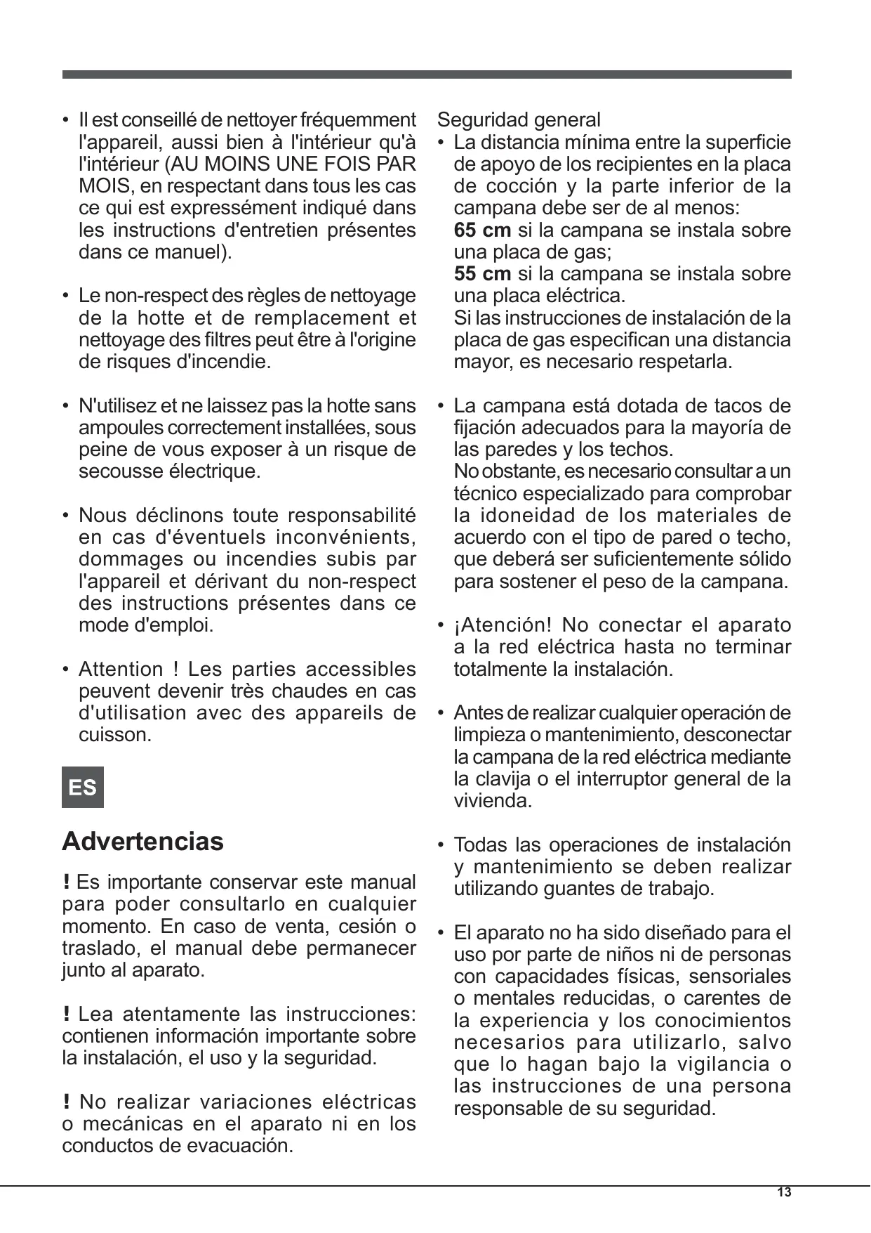 - El local debe disponer de suficiente ventilación cuando la campana se utiliza simultáneamente con otros aparatos que empleen gas u otros combustibles.