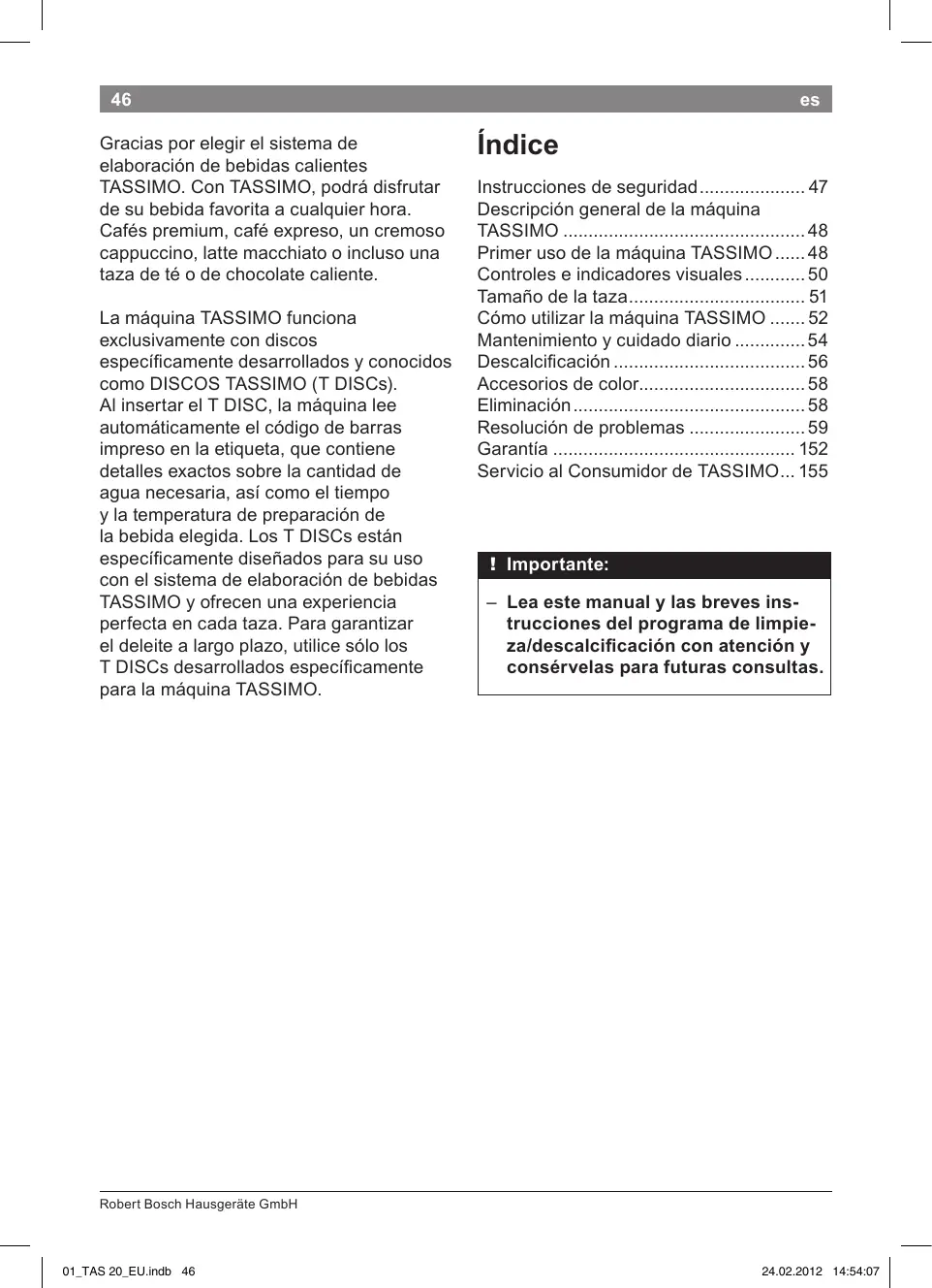 Gracias por elegir el sistema de elaboración de bebidas calientes TASSIMO. Con TASSIMO, podrá disfrutar de su bebida favorita a cualquier hora. Cafés premium, café expreso, un cremoso cappuccino, latte macchiato o incluso una taza de té o de chocolate caliente. La máquina TASSIMO funciona exclusivamente con discos específicamente desarrollados y conocidos como DISCOS TASSIMO (T DISCs). Al insertar el T DISC, la máquina lee automáticamente el código de barras impreso en la etiqueta, que contiene detalles exactos sobre la cantidad de agua necesaria, así como el tiempo y la temperatura de preparación de la bebida elegida. Los T DISCs están específicamente diseñados para su uso con el sistema de elaboración de bebidas TASSIMO y ofrecen una experiencia perfecta en cada taza. Para garantizar el deleite a largo plazo, utilice sólo los T DISCs desarrollados específicamente para la máquina TASSIMO.