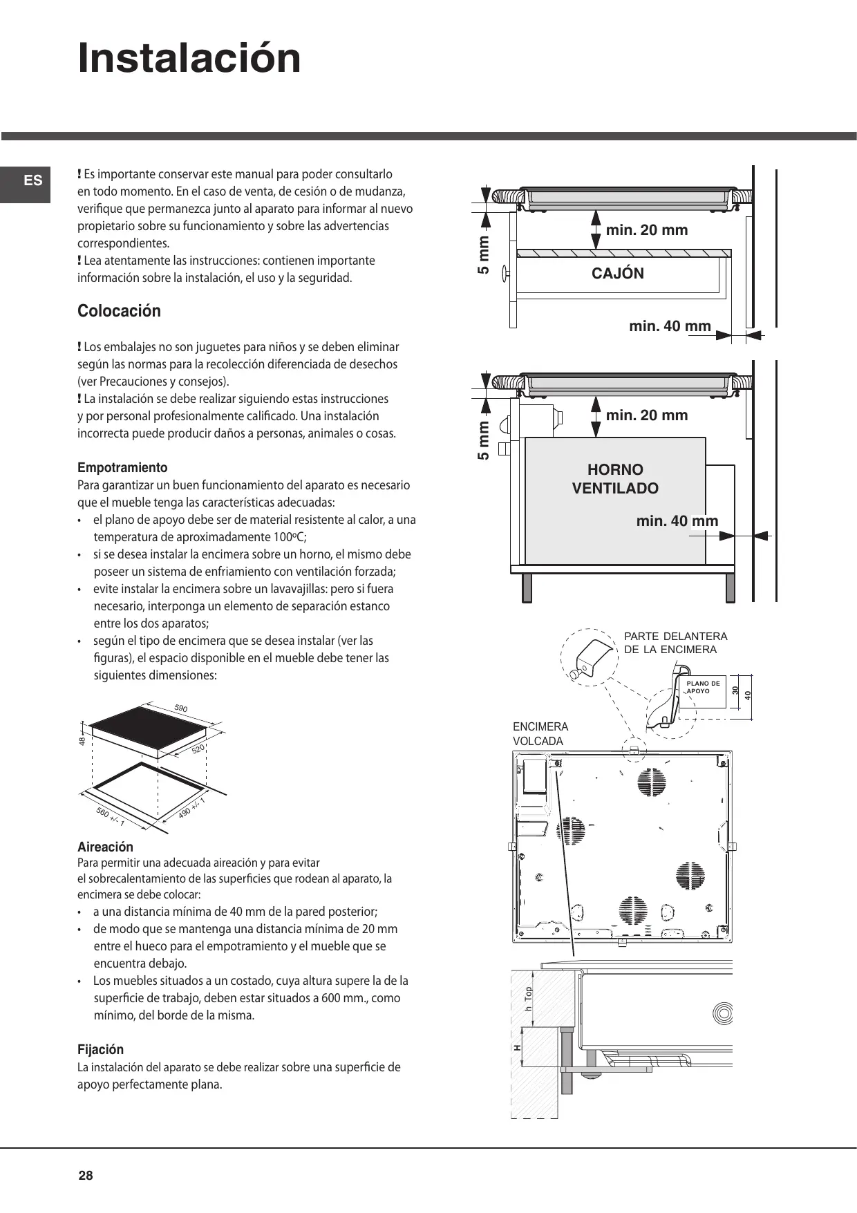 Para permitir una adecuada aireación y para evitar el sobrecalentamiento de las superficies que rodean al aparato, la encimera se debe colocar: