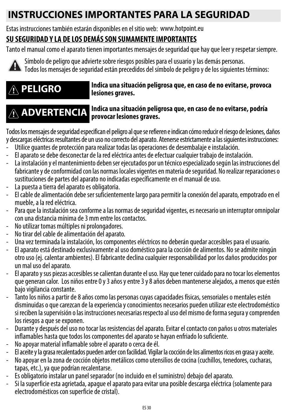 Estas instrucciones también estarán disponibles en el sitio web: www.hotpoint.eu SU SEGURIDAD Y LA DE LOS DEMÁS SON SUMAMENTE IMPORTANTES Tanto el manual como el aparato tienen importantes mensajes de seguridad que hay que leer y respetar siempre. Símbolo de peligro que advierte sobre riesgos posibles para el usuario y las demás personas. Todos los mensajes de seguridad están precedidos del símbolo de peligro y de los siguientes términos: PELIGRO Indica una situación peligrosa que, en caso de no evitarse, provoca lesiones graves. ADVERTENCIA Indica una situación peligrosa que, en caso de no evitarse, podría provocar lesiones graves. Todos los mensajes de seguridad especifican el peligro al que se refieren e indican cómo reducir el riesgo de lesiones, daños y descargas eléctricas resultantes de un uso no correcto del aparato. Atenerse estrictamente a las siguientes instrucciones: - Utilice guantes de protección para realizar todas las operaciones de desembalaje e instalación. - El aparato se debe desconectar de la red eléctrica antes de efectuar cualquier trabajo de instalación. - La instalación y el mantenimiento deben ser ejecutados por un técnico especializado según las instrucciones del fabricante y de conformidad con las normas locales vigentes en materia de seguridad. No realizar reparaciones o sustituciones de partes del aparato no indicadas específicamente en el manual de uso. - La puesta a tierra del aparato es obligatoria. - El cable de alimentación debe ser suficientemente largo para permitir la conexión del aparato, empotrado en el mueble, a la red eléctrica. - Para que la instalación sea conforme a las normas de seguridad vigentes, es necesario un interruptor omnipolar con una distancia mínima de 3 mm entre los contactos. - No utilizar tomas múltiples ni prolongadores. - No tirar del cable de alimentación del aparato. - Una vez terminada la instalación, los componentes eléctricos no deberán quedar accesibles para el usuario. - El aparato está destinado exclusivamente al uso doméstico para la cocción de alimentos. No se admite ningún otro uso (ej. calentar ambientes). El fabricante declina cualquier responsabilidad por los daños producidos por un mal uso del aparato. - El aparato y sus piezas accesibles se calientan durante el uso. Hay que tener cuidado para no tocar los elementos que generan calor. Los niños entre 0 y 3 años y entre 3 y 8 años deben mantenerse alejados, a menos que estén bajo vigilancia constante. - Tanto los niños a partir de 8 años como las personas cuyas capacidades físicas, sensoriales o mentales estén disminuidas o que carezcan de la experiencia y conocimientos necesarios pueden utilizar este electrodoméstico si reciben la supervisión o las instrucciones necesarias respecto al uso del mismo de forma segura y comprenden los riesgos a que se exponen. - Durante y después del uso no tocar las resistencias del aparato. Evitar el contacto con paños u otros materiales inflamables hasta que todos los componentes del aparato se hayan enfriado lo suficiente. - No apoyar material inflamable sobre el aparato o cerca de él. - El aceite y la grasa recalentados pueden arder con facilidad. Vigilar la cocción de los alimentos ricos en grasa y aceite. - No apoyar en la zona de cocción objetos metálicos como utensilios de cocina (cuchillos, tenedores, cucharas, tapas, etc.), ya que podrían recalentarse. - Es obligatorio instalar un panel separador (no incluido en el suministro) debajo del aparato. - Si la superficie esta agrietada, apague el aparato para evitar una posible descarga eléctrica (solamente para electrodomésticos con superficie de cristal). ES 30 - El aparato no está destinado a ponerse en funcionamiento por medio de un temporizador externo o de un sistema de mando a distancia por separado. - Si deja en la placa comida con grasa o aceite, puede ser peligroso y puede provocar un incendio. NUNCA intente apagar un fuego con agua. Apague el aparato y luego cubra la llama, por ejemplo con una tapa o una manta ignífuga. Peligro de incendio: no almacene cosas en las superficies de cocción. - No utilice limpiadores a vapor. - No se debe colocar en la superficie de la placa objetos metálicos como cuchillos, tenedores, cucharas y tapas, ya que pueden calentarse. - Después de usarla, apague la placa con el mando y no se base en el detector de sartenes (solamente para placas de inducción).