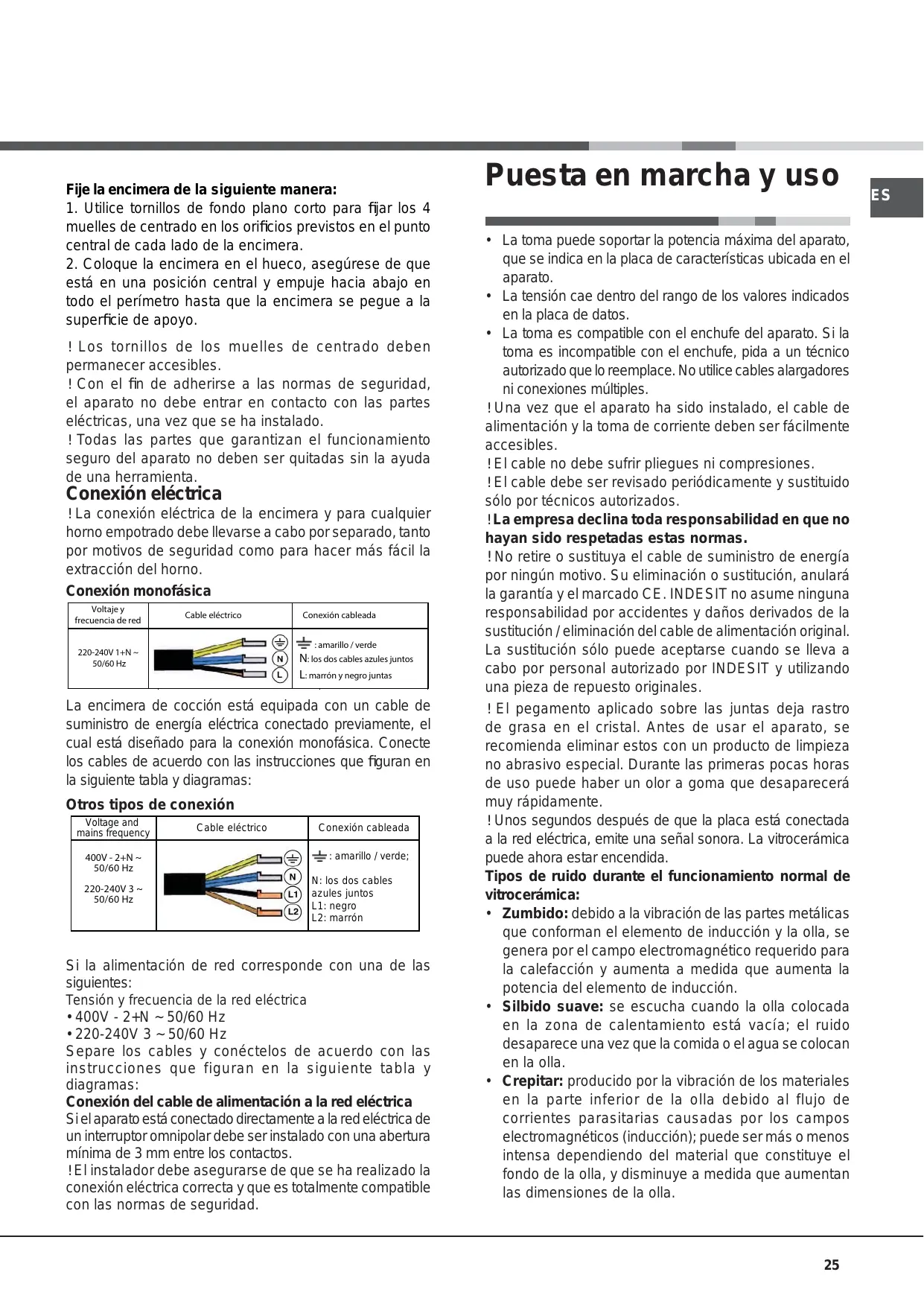 • La toma puede soportar la potencia máxima del aparato, que se indica en la placa de características ubicada en el aparato. • La tensión cae dentro del rango de los valores indicados en la placa de datos. • La toma es compatible con el enchufe del aparato. Si la toma es incompatible con el enchufe, pida a un técnico autorizado que lo reemplace. No utilice cables alargadores ni conexiones múltiples. ! Una vez que el aparato ha sido instalado, el cable de alimentación y la toma de corriente deben ser fácilmente accesibles. ! El cable no debe sufrir pliegues ni compresiones. ! El cable debe ser revisado periódicamente y sustituido sólo por técnicos autorizados. ! La empresa declina toda responsabilidad en que no hayan sido respetadas estas normas. ! No retire o sustituya el cable de suministro de energía por ningún motivo. Su eliminación o sustitución, anulará la garantía y el marcado CE. INDESIT no asume ninguna responsabilidad por accidentes y daños derivados de la sustitución / eliminación del cable de alimentación original. La sustitución sólo puede aceptarse cuando se lleva a cabo por personal autorizado por INDESIT y utilizando una pieza de repuesto originales. ! El pegamento aplicado sobre las juntas deja rastro de grasa en el cristal. Antes de usar el aparato, se recomienda eliminar estos con un producto de limpieza no abrasivo especial. Durante las primeras pocas horas de uso puede haber un olor a goma que desaparecerá muy rápidamente. ! Unos segundos después de que la placa está conectada a la red eléctrica, emite una señal sonora. La vitrocerámica puede ahora estar encendida. Tipos de ruido durante el funcionamiento normal de vitrocerámica: • Zumbido: debido a la vibración de las partes metálicas que conforman el elemento de inducción y la olla, se genera por el campo electromagnético requerido para la calefacción y aumenta a medida que aumenta la potencia del elemento de inducción. • Silbido suave: se escucha cuando la olla colocada en la zona de calentamiento está vacía; el ruido desaparece una vez que la comida o el agua se colocan en la olla. • Crepitar: producido por la vibración de los materiales en la parte inferior de la olla debido al flujo de corrientes parasitarias causadas por los campos electromagnéticos (inducción); puede ser más o menos intensa dependiendo del material que constituye el fondo de la olla, y disminuye a medida que aumentan las dimensiones de la olla.