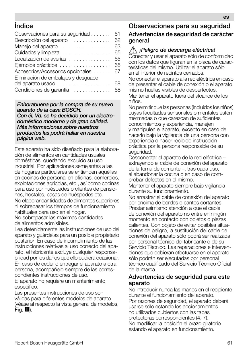 båÜçê~ÄìÉå~=éçê=ä~=Åçãéê~=ÇÉ=ëì=åìÉîç= ~é~ê~íç=ÇÉ=ä~=Å~ë~=_lp`eK `çå=¨äI=sÇK=ëÉ=Ü~=ÇÉÅáÇáÇç=éçê=ìå=ÉäÉÅíêçJ Ççã¨ëíáÅç=ãçÇÉêåç=ó=ÇÉ=Öê~å=Å~äáÇ~ÇK j•ë=áåÑçêã~ÅáçåÉë=ëçÄêÉ=åìÉëíêçë= éêçÇìÅíçë=ä~ë=éçÇê•=Ü~ää~ê=Éå=åìÉëíê~= é•Öáå~=ïÉÄK Este aparato ha sido diseñado para la elaboración de alimentos en cantidades usuales domésticas, quedando excluido su uso industrial. Por aplicaciones semejantes a las de hogares particulares se entienden aquéllas en cocinas de personal en oficinas, comercios, explotaciones agrícolas, etc., así como cocinas para uso por huéspedes o clientes de pensiones, hostales, casas de huéspedes etc. No elaborar cantidades de alimentos superiores ni sobrepasar los tiempos de funcionamiento habituales para uso en el hogar. No sobrepasar las máximas cantidades de alimentos admisibles. Lea detenidamente las instrucciones de uso del aparato y guárdelas para un posible propietario posterior. En caso de incumplimiento de las instrucciones relativas al uso correcto del aparato, el fabricante excluye cualquier responsabilidad por los daños que ello pudiera ocasionar. En caso de ceder o entregar el aparato a otra persona, acompáñelo siempre de las correspondientes instrucciones de uso. El aparato no requiere un mantenimiento especifico. Las presentes instrucciones de uso son válidas para diferentes modelos de aparato (véase al respecto la vista general de modelos, Fig. ). Robert Bosch Hausgeräte GmbH Advertencias de seguridad de carácter general flmÉäáÖêç=ÇÉ=ÇÉëÅ~êÖ~=Éä¨ÅíêáÅ~> Conectar y usar el aparato sólo de conformidad con los datos que figuran en la placa de características del mismo. Utilizar el aparato sólo en el interior de recintos cerrados. No conectar el aparato a la red eléctrica en caso de presentar el cable de conexión o el aparato mismo huellas visibles de desperfectos. Mantener el aparato fuera del alcance de los niños. No permitir que las personas (incluidos los niños) cuyas facultades sensoriales o mentales estén mermadas o que carezcan de suficientes conocimientos y experiencia, manejen y manipulen el aparato, excepto en caso de hacerlo bajo la vigilancia de una persona con experiencia o hacer recibido instrucción práctica por la persona responsable de su seguridad. Desconectar el aparato de la red eléctrica – extrayendo el cable de conexión del aparato de la toma de corriente –, tras cada uso, al abandonar la cocina o en caso de comprobar defectos en el mismo. Mantener el aparato siempre bajo vigilancia durante su funcionamiento. No arrastrar el cable de conexión del aparato por encima de bordes o cantos cortantes. Prestar asimismo atención a que el cable de conexión del aparato no entre en ningún momento en contacto con objetos o piezas calientes. Con objeto de evitar posibles situaciones de peligro, la sustitución del cable de conexión del aparato sólo podrá ser realizada por personal técnico del fabricante o de su Servicio Técnico. Las reparaciones e intervenciones que debieran efectuarse en el aparato sólo podrán ser ejecutadas por personal técnico cualificado del Servicio Técnico Oficial de la marca. Advertencias de seguridad para este aparato No introducir nunca las manos en el recipiente durante el funcionamiento del aparato. Por razones de seguridad, el aparato deberá usarse sólo estando los accionamientos no utilizados cubiertos con las tapas protectoras correspondientes (4, 7). No modificar la posición el brazo giratorio estando el aparato en funcionamiento.