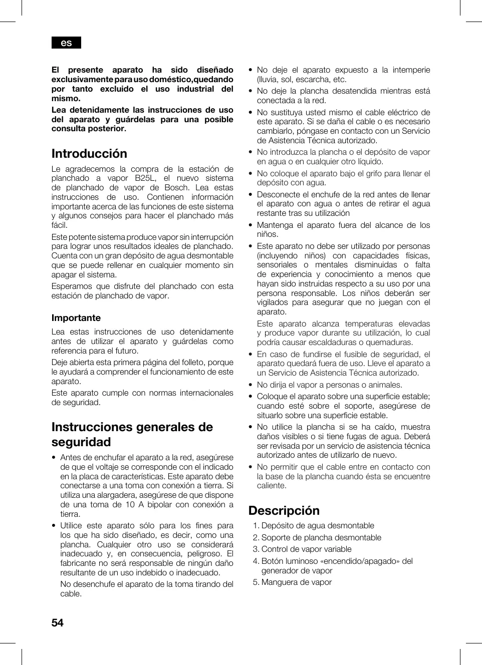 El presente aparato ha sido diseñado exclusivamente para uso doméstico,quedando por tanto excluido el uso industrial del mismo. Lea detenidamente las instrucciones de uso del aparato y guárdelas para una posible consulta posterior. Introducción Le agradecemos la compra de la estación de planchado a vapor B25L, el nuevo sistema de planchado de vapor de Bosch. Lea estas instrucciones de uso. Contienen información importante acerca de las funciones de este sistema y algunos consejos para hacer el planchado más fácil. Este potente sistema produce vapor sin interrupción para lograr unos resultados ideales de planchado. Cuenta con un gran depósito de agua desmontable que se puede rellenar en cualquier momento sin apagar el sistema. Esperamos que disfrute del planchado con esta estación de planchado de vapor. Importante Lea estas instrucciones de uso detenidamente antes de utilizar el aparato y guárdelas como referencia para el futuro. Deje abierta esta primera página del folleto, porque le ayudará a comprender el funcionamiento de este aparato. Este aparato cumple con normas internacionales de seguridad. Instrucciones generales de seguridad