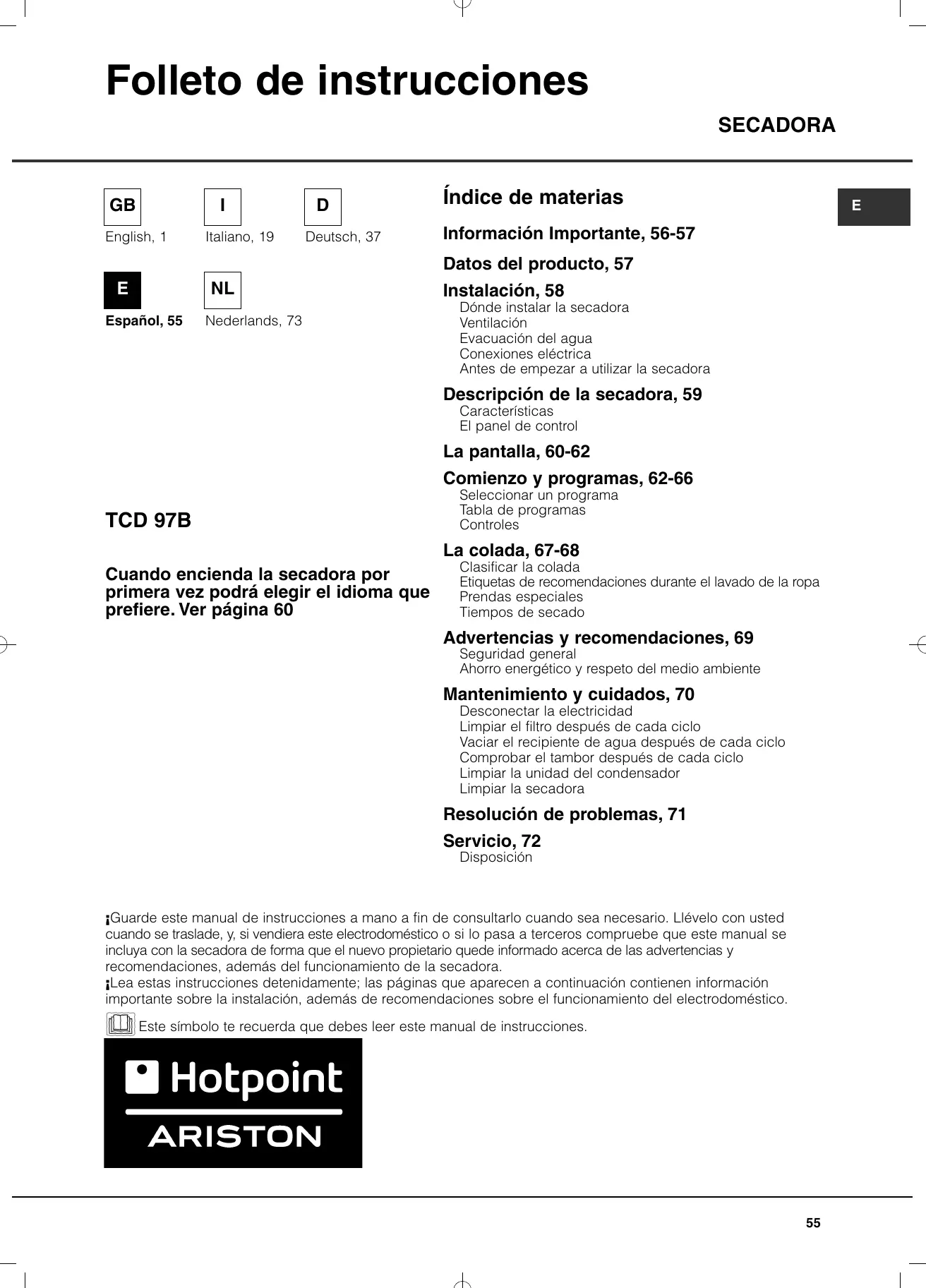 Encuentra gratis el manual del aparato TCD 97B 6HY/N HOTPOINT en formato PDF.