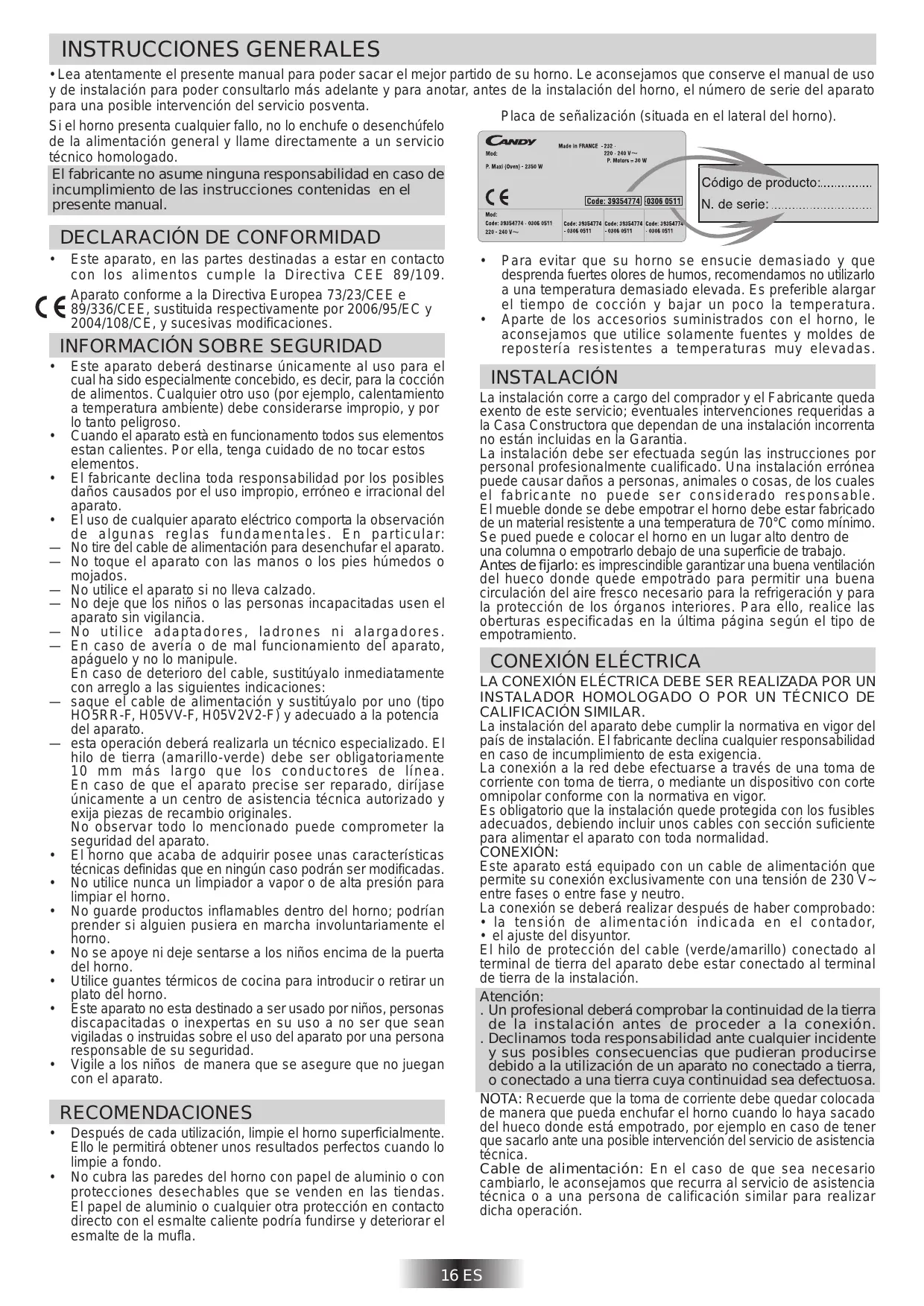 - Lea atentamente el presente manual para poder sacar el mejor partido de su horno. Le aconsejamos que conserve el manual de uso y de instalación para poder consultarlo más adelante y para anotar, antes de la instalación del horno, el número de serie del aparato para una posible intervención del servicio posventa. Placa de señalización (situada en el lateral del horno). Si el horno presenta cualquier fallo, no lo enchufe o desenchúfelo de la alimentación general y llame directamente a un servicio técnico homologado. El fabricante no asume ninguna responsabilidad en caso de incumplimiento de las instrucciones contenidas en el presente manual.