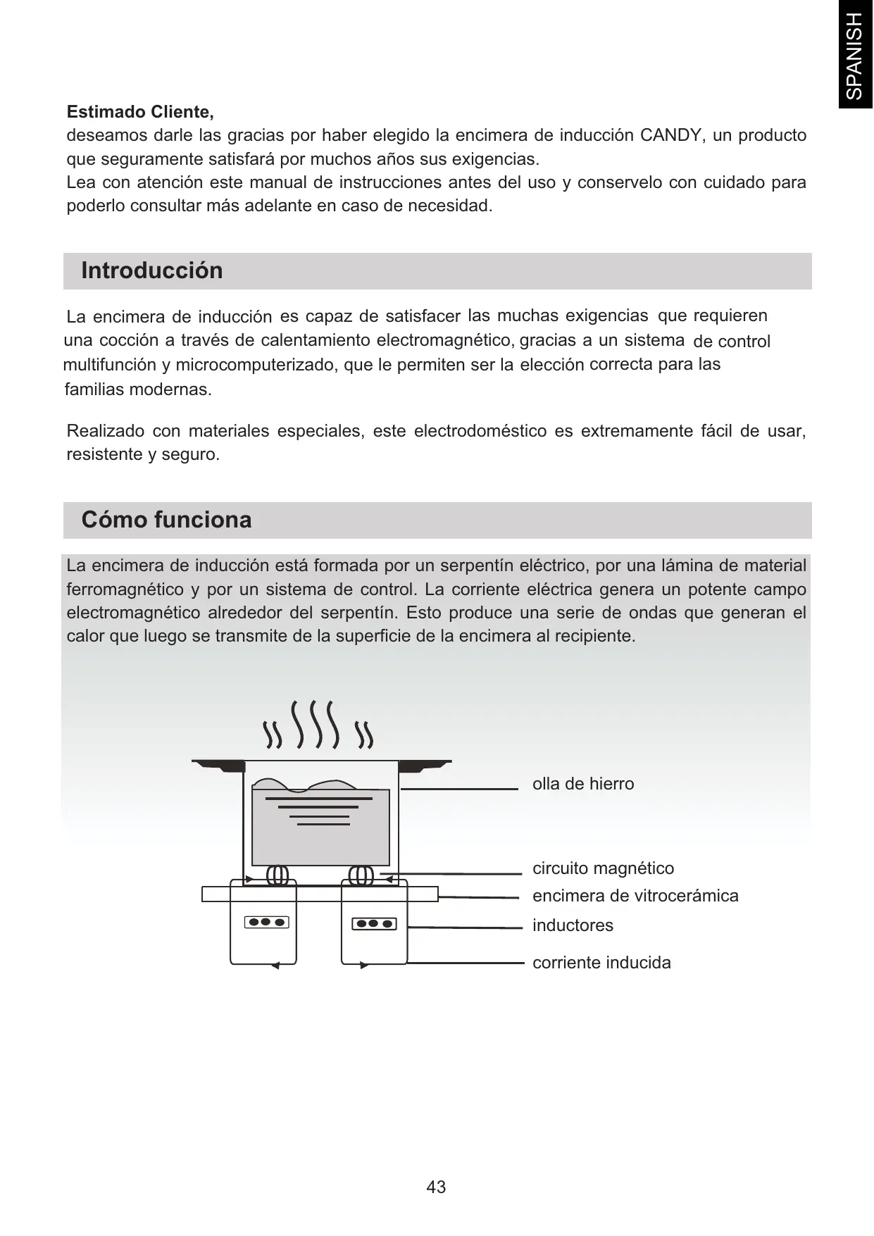SPANISH Estimado Cliente, deseamos darle las gracias por haber elegido la encimera de inducción CANDY, un producto que seguramente satisfará por muchos años sus exigencias. Lea con atención este manual de instrucciones antes del uso y conservelo con cuidado para poderlo consultar más adelante en caso de necesidad. Introducción La encimera de inducción es capaz de satisfacer las muchas exigencias que requieren una cocción a través de calentamiento electromagnético, gracias a un sistema de control multifunción y microcomputerizado, que le permiten ser la elección correcta para las familias modernas. Realizado con materiales especiales, este electrodoméstico es extremamente fácil de usar, resistente y seguro. Cómo funciona La encimera de inducción está formada por un serpentín eléctrico, por una lámina de material ferromagnético y por un sistema de control. La corriente eléctrica genera un potente campo electromagnético alrededor del serpentín. Esto produce una serie de ondas que generan el calor que luego se transmite de la superficie de la encimera al recipiente. olla de hierro circuito magnético encimera de vitrocerámica inductores corriente inducida