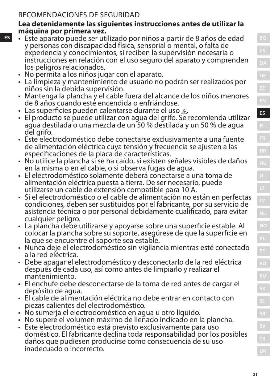 Lea detenidamente las siguientes instrucciones antes de utilizar la máquina por primera vez. • Este aparato puede ser utilizado por niños a partir de 8 años de edad y personas con discapacidad física, sensorial o mental, o falta de experiencia y conocimientos, si reciben la supervisión necesaria o instrucciones en relación con el uso seguro del aparato y comprenden los peligros relacionados. • No permita a los niños jugar con el aparato. • La limpieza y mantenimiento de usuario no podrán ser realizados por niños sin la debida supervisión. • Mantenga la plancha y el cable fuera del alcance de los niños menores de 8 años cuando esté encendida o enfriándose. • Las superficies pueden calentarse durante el uso . • El producto se puede utilizar con agua del grifo. Se recomienda utilizar agua destilada o una mezcla de un 50 % destilada y un 50 % de agua del grifo. • Este electrodoméstico debe conectarse exclusivamente a una fuente de alimentación eléctrica cuya tensión y frecuencia se ajusten a las especificaciones de la placa de características. • No utilice la plancha si se ha caído, si existen señales visibles de daños en la misma o en el cable, o si observa fugas de agua. • El electrodoméstico solamente deberá conectarse a una toma de alimentación eléctrica puesta a tierra. De ser necesario, puede utilizarse un cable de extensión compatible para 10 A. • Si el electrodoméstico o el cable de alimentación no están en perfectas condiciones, deben ser sustituidos por el fabricante, por su servicio de asistencia técnica o por personal debidamente cualificado, para evitar cualquier peligro. • La plancha debe utilizarse y apoyarse sobre una superficie estable. Al colocar la plancha sobre su soporte, asegúrese de que la superficie en la que se encuentre el soporte sea estable. • Nunca deje el electrodoméstico sin vigilancia mientras esté conectado a la red eléctrica. • Debe apagar el electrodoméstico y desconectarlo de la red eléctrica después de cada uso, así como antes de limpiarlo y realizar el mantenimiento. • El enchufe debe desconectarse de la toma de red antes de cargar el depósito de agua. • El cable de alimentación eléctrica no debe entrar en contacto con piezas calientes del electrodoméstico. • No sumerja el electrodoméstico en agua u otro líquido. • No supere el volumen máximo de llenado indicado en la plancha. • Este electrodoméstico está previsto exclusivamente para uso doméstico. El fabricante declina toda responsabilidad por los posibles daños que pudiesen producirse como consecuencia de su uso inadecuado o incorrecto.