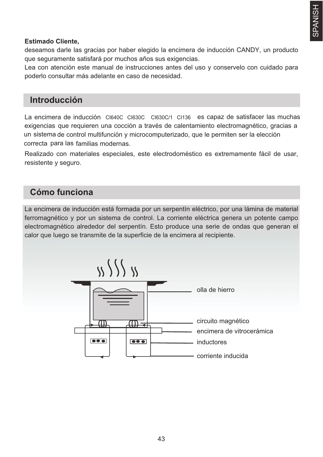 SPANISH Estimado Cliente, deseamos darle las gracias por haber elegido la encimera de inducción CANDY, un producto que seguramente satisfará por muchos años sus exigencias. Lea con atención este manual de instrucciones antes del uso y conservelo con cuidado para poderlo consultar más adelante en caso de necesidad. Introducción La encimera de inducción CI640C CI630C CI630C/1 CI136 es capaz de satisfacer las muchas exigencias que requieren una cocción a través de calentamiento electromagnético, gracias a un sistema de control multifunción y microcomputerizado, que le permiten ser la elección correcta para las familias modernas. Realizado con materiales especiales, este electrodoméstico es extremamente fácil de usar, resistente y seguro. Cómo funciona La encimera de inducción está formada por un serpentín eléctrico, por una lámina de material ferromagnético y por un sistema de control. La corriente eléctrica genera un potente campo electromagnético alrededor del serpentín. Esto produce una serie de ondas que generan el calor que luego se transmite de la superficie de la encimera al recipiente. olla de hierro circuito magnético encimera de vitrocerámica inductores corriente inducida