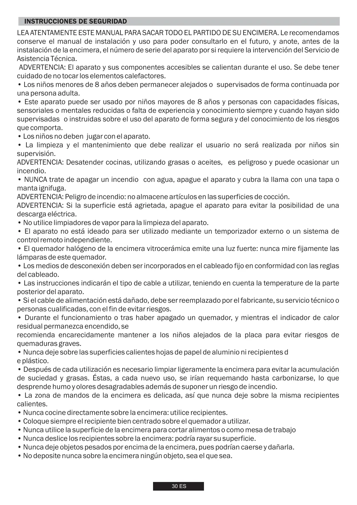 LEA ATENTAMENTE ESTE MANUAL PARA SACAR TODO EL PARTIDO DE SU ENCIMERA. Le recomendamos conserve el manual de instalación y uso para poder consultarlo en el futuro, y anote, antes de la instalación de la encimera, el número de serie del aparato por si requiere la intervención del Servicio de Asistencia Técnica. ADVERTENCIA: El aparato y sus componentes accesibles se calientan durante el uso. Se debe tener cuidado de no tocar los elementos calefactores.