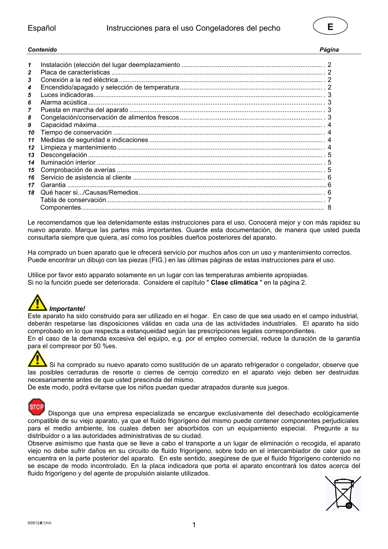 - Componentes Le recomendamos que lea detenidamente estas instrucciones para el uso. Conocerá mejor y con más rapidez su nuevo aparato. Marque las partes más importantes. Guarde esta documentación, de manera que usted pueda consultarla siempre que quiera, así como los posibles dueños posteriores del aparato. Ha comprado un buen aparato que le ofrecerá servicio por muchos años con un uso y mantenimiento correctos. Puede encontrar un dibujo con las piezas (FIG.) en las últimas páginas de estas instrucciones para el uso. Utilice por favor esto apparato solamente en un lugar con las temperaturas ambiente apropiadas. Si no la función puede ser deteriorada. Considere el capítulo " Clase climática " en la página 2. Importante! Este aparato ha sido construido para ser utilizado en el hogar. En caso de que sea usado en el campo industrial, deberán respetarse las disposiciones válidas en cada una de las actividades industriales. El aparato ha sido comprobado en lo que respecta a estanqueidad según las prescripciones legales correspondientes. En el caso de la demanda excesiva del equipo, e.g. por el empleo comercial, reduce la duración de la garantía para el compresor por 50 %es. Si ha comprado su nuevo aparato como sustitución de un aparato refrigerador o congelador, observe que las posibles cerraduras de resorte o cierres de cerrojo corredizo en el aparato viejo deben ser destruidas necesariamente antes de que usted prescinda del mismo. De este modo, podrá evitarse que los niños puedan quedar atrapados durante sus juegos. Disponga que una empresa especializada se encargue exclusivamente del desechado ecológicamente compatible de su viejo aparato, ya que el fluido frigorígeno del mismo puede contener componentes perjudiciales para el medio ambiente, los cuales deben ser absorbidos con un equipamiento especial. Pregunte a su distribuidor o a las autoridades administrativas de su ciudad. Observe asimismo que hasta que se lleve a cabo el transporte a un lugar de eliminación o recogida, el aparato viejo no debe sufrir daños en su circuito de fluido frigorígeno, sobre todo en el intercambiador de calor que se encuentra en la parte posterior del aparato. En este sentido, asegúrese de que el fluido frigorígeno contenido no se escape de modo incontrolado. En la placa indicadora que porta el aparato encontrará los datos acerca del fluido frigorígeno y del agente de propulsión aislante utilizados. ©0512fiCONS p. 8