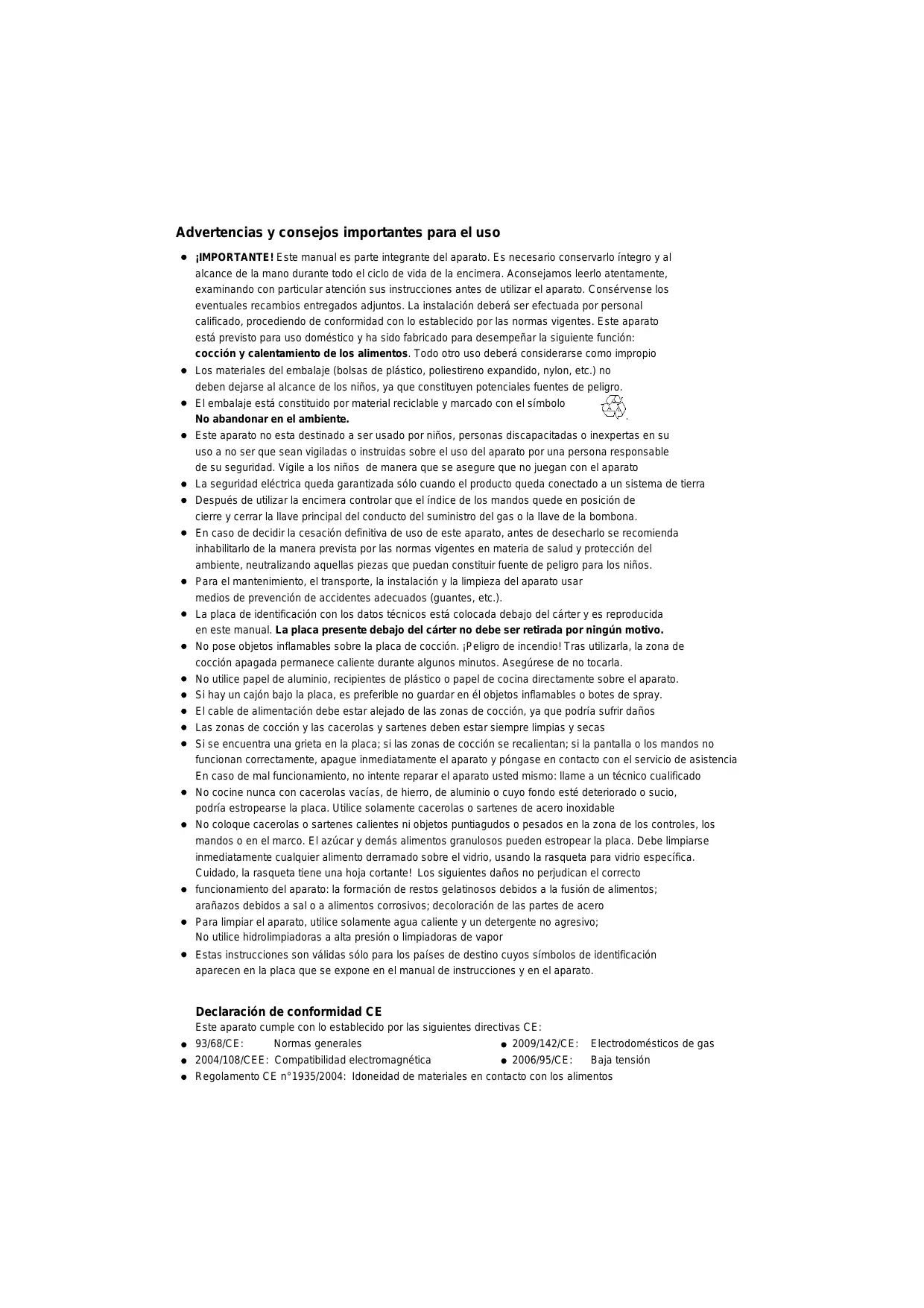 Advertencias: Este aparato está diseñado para ser encastrado en muebles - La clase de instalación es 3 para la parte gas e Y para la parte eléctrica. - Los muebles deben resistir a una temperatura mínima de 90°C. - Para una correcta instalación ver el apartado y los dibujos correspondientes. - El uso de un aparato de cocción de gas produce humedad y calor en el local donde se encuentra. Tener el local bien aireado o instalar un dispositivo mecánico de aireación (campana de ventilación). Un uso intensivo y prolongado del equipo puede requerir aireación suplementaria (como abrir una ventana) o una forma más eficaz (como aumentar la velocidad de la campana). Este manual contiene instrucciones útiles para distintos tipos de planos de cocción. En la placa de datos en la parte inferior del aparato se lee el modelo (Mod. Tc). Con esta sigla, siguiendo la indicaciones de los próximos párrafos y observando los diseños incluidos al final del manual, se puede conocer la composición del aparato. Ejemplo: Legenda: (1) Marca comercial (2) Modelo correspondiente (3) Código técnico (4) Código del cliente (5) Entradas de energía (6) Voltaje y datos de la frecuencia (7) País y tipo del gas detalles (8) Potencía quemadores (9) Concumicion quemadores