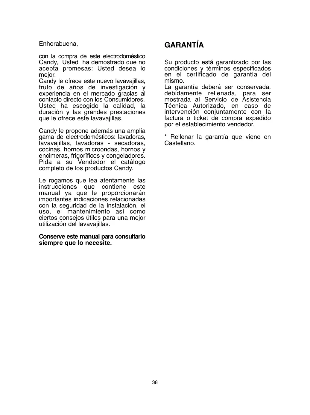 - Rellenar la garantía que viene en Castellano. Le rogamos que lea atentamente las instrucciones que contiene este manual ya que le proporcionarán importantes indicaciones relacionadas con la seguridad de la instalación, el uso, el mantenimiento así como ciertos consejos útiles para una mejor utilización del lavavajillas. Conserve este manual para consultarlo siempre que lo necesite.