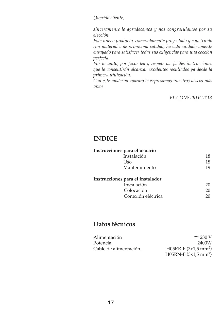 Querido cliente, sinceramente le agradecemos y nos congratulamos por su elección. Este nuevo producto, esmeradamente proyectado y construido con materiales de primísima calidad, ha sido cuidadosamente ensayado para satisfacer todas sus exigencias para una cocción perfecta. Por lo tanto, por favor lea y respete las fáciles instrucciones que le consentirán alcanzar excelentes resultados ya desde la primera utilización. Con este moderno aparato le expresamos nuestros deseos más vivos. EL CONSTRUCTOR INDICE Instrucciones para el usuario Instalación Uso Mantenimiento
