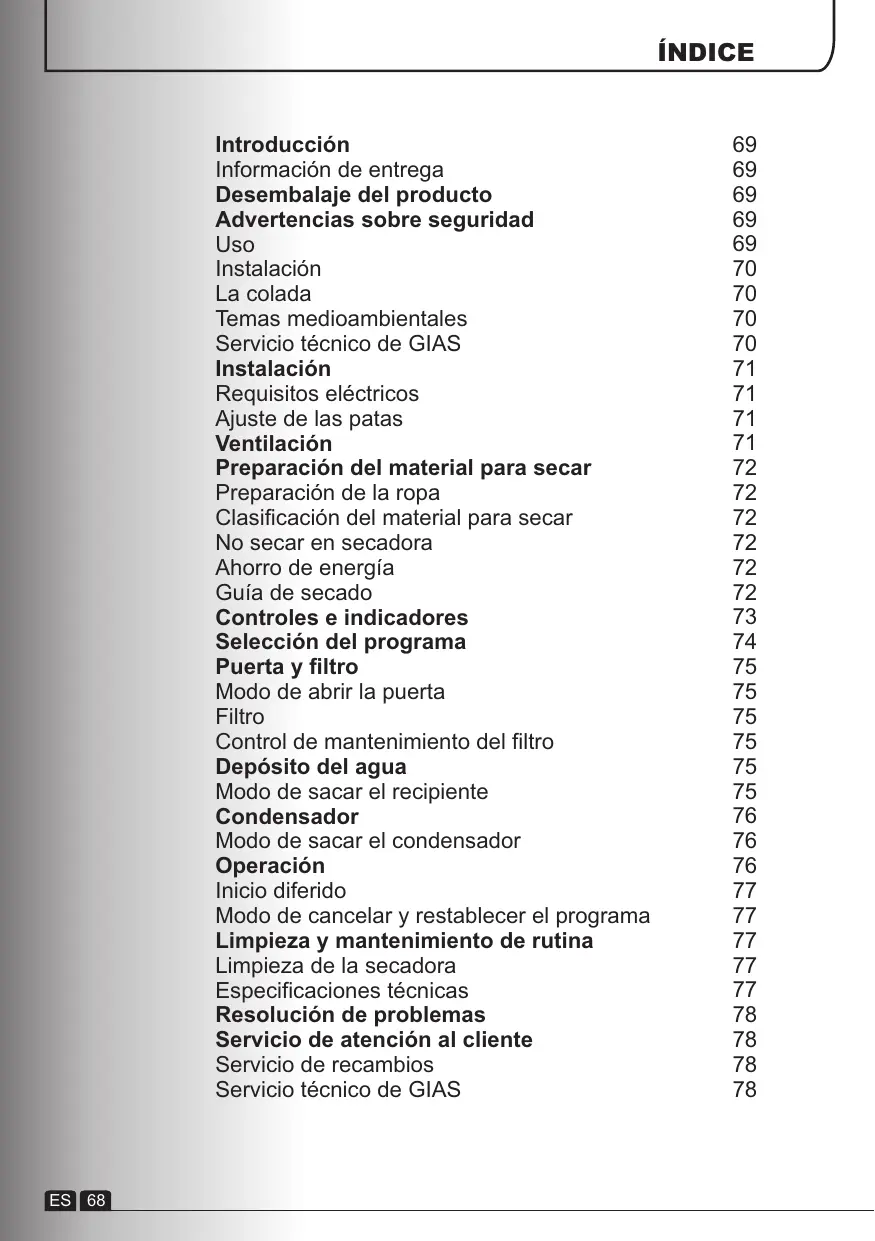 ÍNDICE Introducción Información de entrega Desembalaje del producto Advertencias sobre seguridad Uso Instalación La colada Temas medioambientales Servicio técnico de GIAS Instalación Requisitos eléctricos Ajuste de las patas Ventilación Preparación del material para secar Preparación de la ropa Clasificación del material para secar No secar en secadora Ahorro de energía Guía de secado Controles e indicadores Selección del programa Puerta y filtro Modo de abrir la puerta Filtro Control de mantenimiento del filtro Depósito del agua Modo de sacar el recipiente Condensador Modo de sacar el condensador Operación Inicio diferido Modo de cancelar y restablecer el programa Limpieza y mantenimiento de rutina Limpieza de la secadora Especificaciones técnicas Resolución de problemas Servicio de atención al cliente Servicio de recambios Servicio técnico de GIAS ES 68