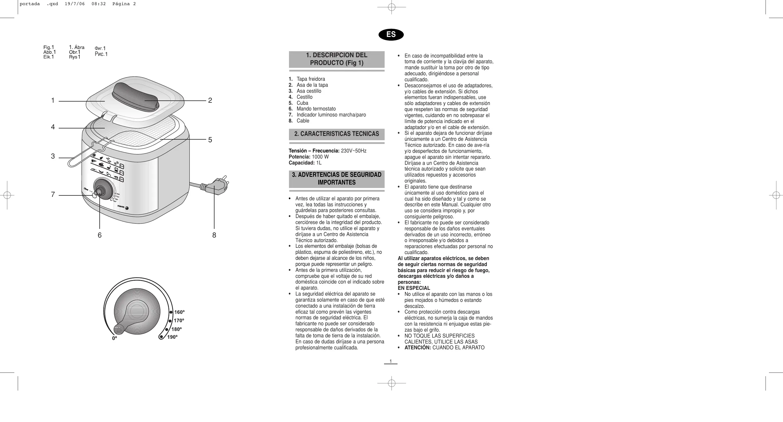 - ATENCIÓN: CUANDO EL APARATO Tapa freidora Asa de la tapa Asa cestillo Cestillo Cuba Mando termostato Indicador luminoso marcha/paro Cable Tensión – Frecuencia: 230V~50Hz Potencia: 1000 W Capacidad: 1L