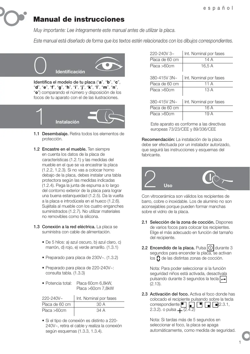 Este aparato es conforme a las directivas europeas 73/23/CEE y 89/336/CEE Recomendación: La instalación de la placa debe ser efectuada por un instalador autorizado, que seguirá las instrucciones y esquemas del fabricante.