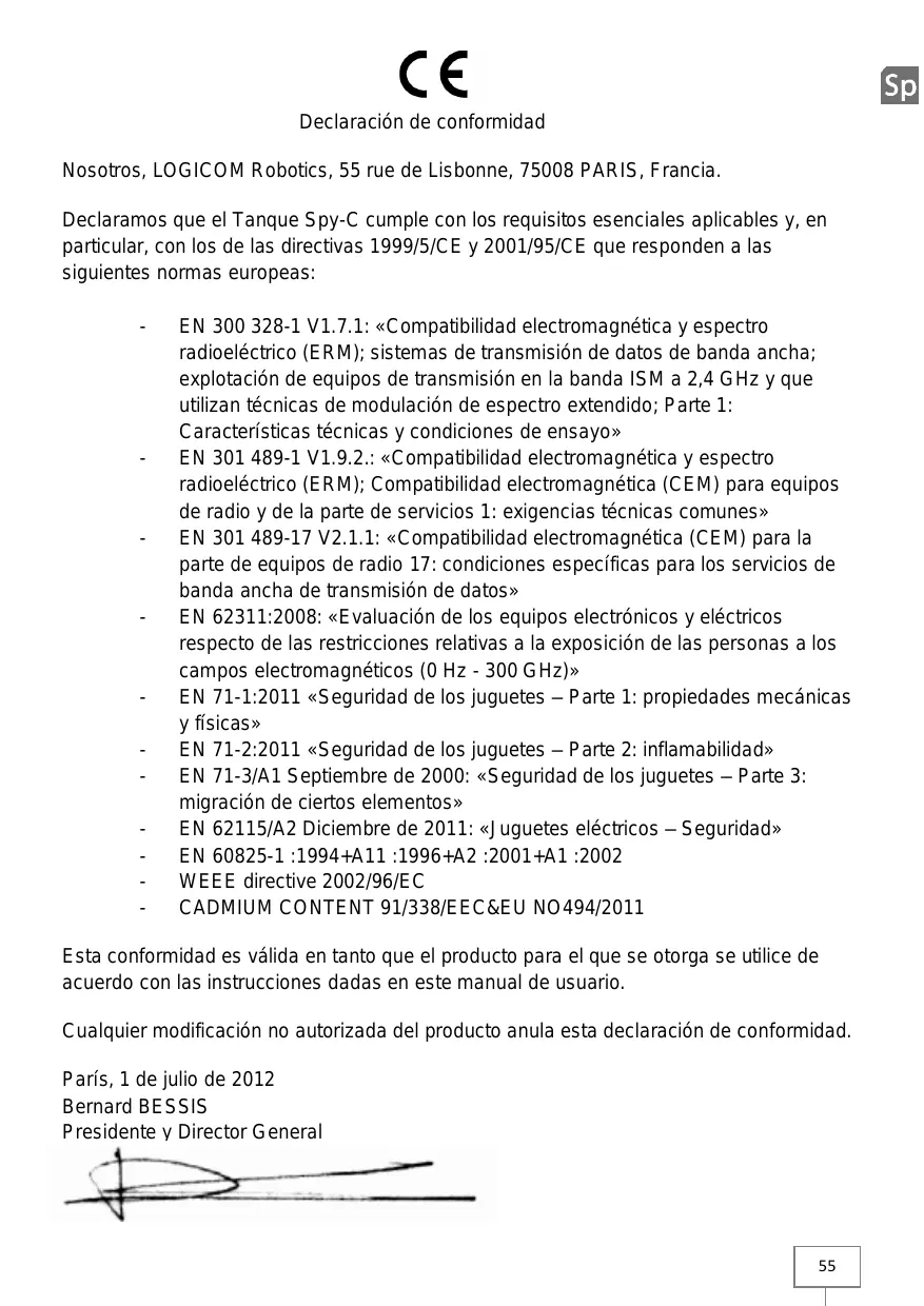 Declaración de conformidad Nosotros, LOGICOM Robotics, 55 rue de Lisbonne, 75008 PARIS, Francia. Declaramos que el Tanque Spy-C cumple con los requisitos esenciales aplicables y, en particular, con los de las directivas 1999/5/CE y 2001/95/CE que responden a las siguientes normas europeas: -