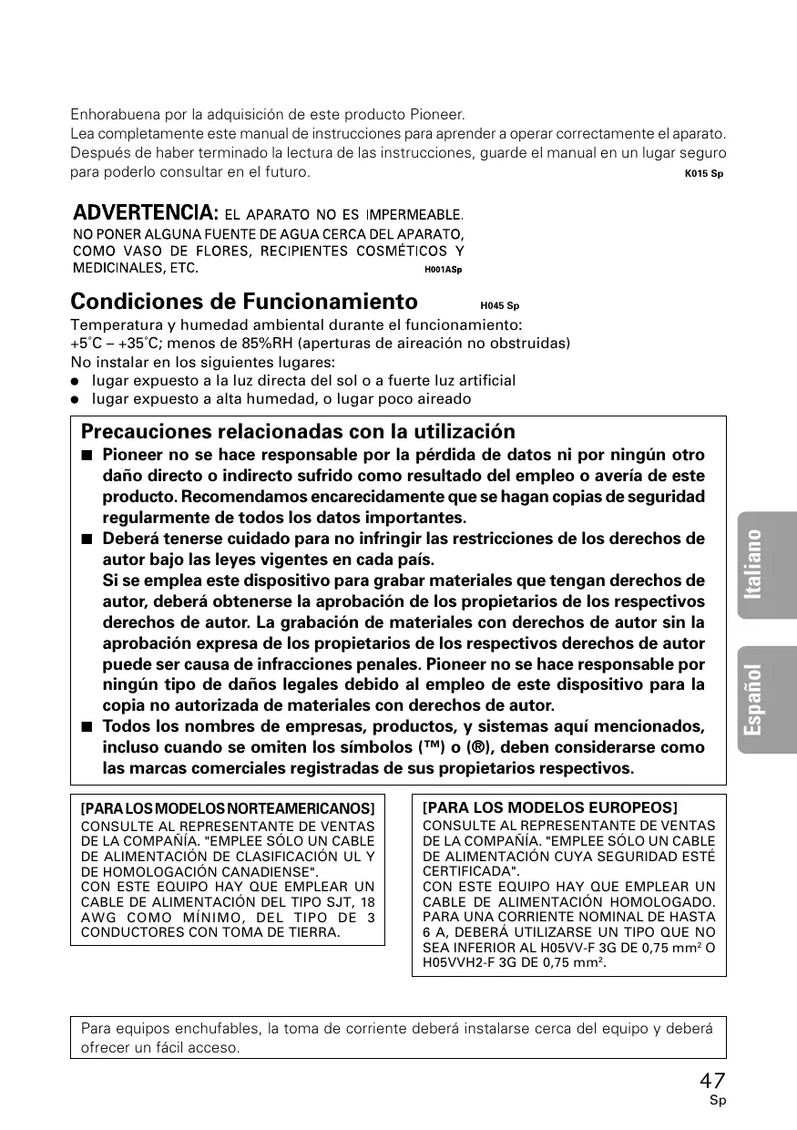 7 Deberá tenerse cuidado para no infringir las restricciones de los derechos de autor bajo las leyes vigentes en cada país. Si se emplea este dispositivo para grabar materiales que tengan derechos de autor, deberá obtenerse la aprobación de los propietarios de los respectivos derechos de autor. La grabación de materiales con derechos de autor sin la aprobación expresa de los propietarios de los respectivos derechos de autor puede ser causa de infracciones penales. Pioneer no se hace responsable por ningún tipo de daños legales debido al empleo de este dispositivo para la copia no autorizada de materiales con derechos de autor. 7 Todos los nombres de empresas, productos, y sistemas aquí mencionados, incluso cuando se omiten los símbolos (™) o (®), deben considerarse como las marcas comerciales registradas de sus propietarios respectivos. [PARA LOS MODELOS NORTEAMERICANOS]