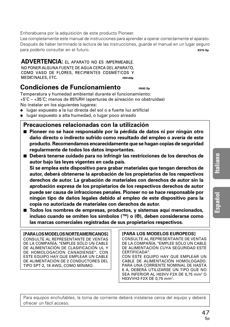 Pioneer no se hace responsable por la perdida de datos ni por ningún(otherdoño directo o indirecto sufrido como resultado del empleo o avería de este producto. Recomendamos encarecidamente que se hagan copias de seguridad regularmente de todos los datos importantes.