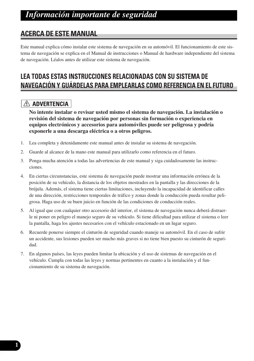 Este manual explica cémo instalar este sistema de navegaciôn en su automôvil. El funcionamiento de este tema de navegacién se explica en el Manual de instrucciones o Manual de hardware independiente del sistema de navegacién. Léalos antes de utilizar este ma de navegaci LEA TODAS ESTAS INSTRUCCIONES RELACIONADAS CON SU SISTEMA DE NAVEGACION Y GUARDELAS PARA EMPLEARLAS COMO.REFERENCIA.EN.EL FUTURO [A ADVERTENCIA | No intente instalar o revisar usted mismo el sistema de navegaciôn. La instalaciôn o revisiôn del sistema de navegaciôn por personas sin formaciôn o experiencia en equipos electrénicos y accesorios para automéviles puede ser peligrosa y podria exponerle a una descarga eléctrica 0 a otros peligros.