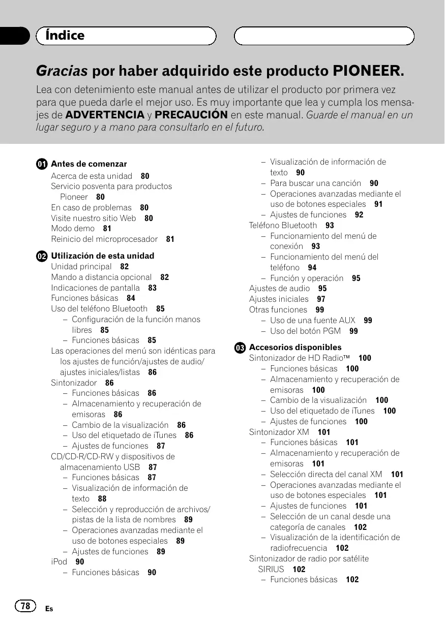 Índice Gracias por haber adquirido este producto PIONEER. Lea con detenimiento este manual antes de utilizar el producto por primera vez para que pueda darle el mejor uso. Es muy importante que lea y cumpla los mensajes de ADVERTENCIA y PRECAUCIÓN en este manual. Guarde el manual en un lugar seguro y a mano para consultarlo en el futuro. Antes de comenzar Acerca de esta unidad 80 Servicio posventa para productos Pioneer 80 En caso de problemas 80 Visite nuestro sitio Web 80 Modo demo 81 Reinicio del microprocesador 81 Utilización de esta unidad Unidad principal 82 Mando a distancia opcional 82 Indicaciones de pantalla 83 Funciones básicas 84 Uso del teléfono Bluetooth 85 – Configuración de la función manos libres 85 – Funciones básicas 85 Las operaciones del menú son idénticas para los ajustes de función/ajustes de audio/ ajustes iniciales/listas 86 Sintonizador 86 – Funciones básicas 86 – Almacenamiento y recuperación de emisoras 86 – Cambio de la visualización 86 – Uso del etiquetado de iTunes 86 – Ajustes de funciones 87 CD/CD-R/CD-RW y dispositivos de almacenamiento USB 87 – Funciones básicas 87 – Visualización de información de texto 88 – Selección y reproducción de archivos/ pistas de la lista de nombres 89 – Operaciones avanzadas mediante el uso de botones especiales 89 – Ajustes de funciones 89 iPod 90 – Funciones básicas 90