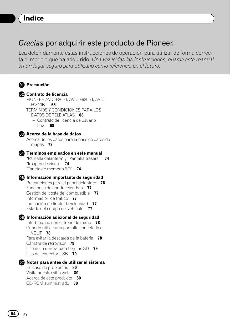 @ cContrato de licencia PIONEER AVIC-F0BT, AVIC-F980BT, AVIC- F9S10BT 66 TÉRMINOS Y CONDICIONES PARA LOS DATOS DE TELE ATLAS 68 — Contrato de licencia de usuario final 68