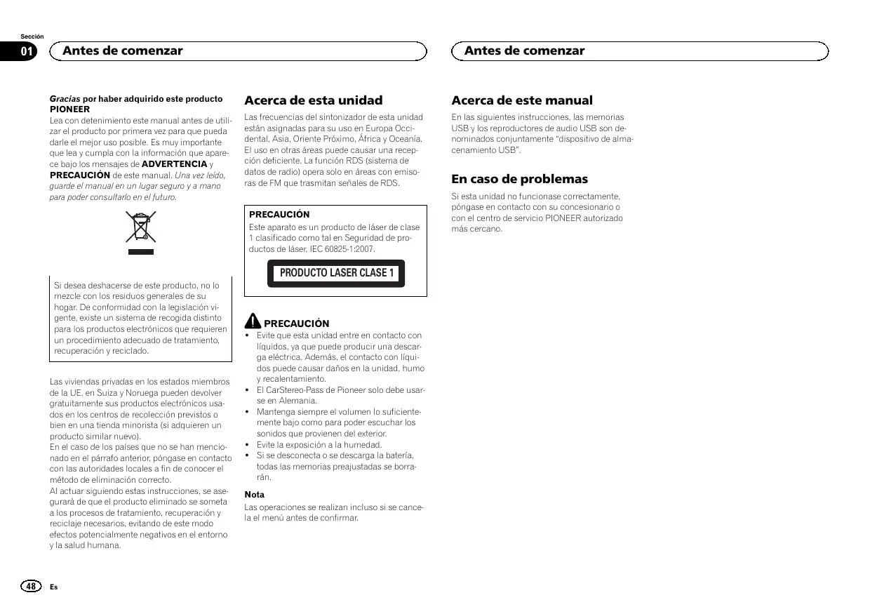 ! Evite que esta unidad entre en contacto con líquidos, ya que puede producir una descarga eléctrica. Además, el contacto con líquidos puede causar daños en la unidad, humo y recalentamiento. ! El CarStereo-Pass de Pioneer solo debe usarse en Alemania. ! Mantenga siempre el volumen lo suficientemente bajo como para poder escuchar los sonidos que provienen del exterior. ! Evite la exposición a la humedad. ! Si se desconecta o se descarga la batería, todas las memorias preajustadas se borrarán. Nota Las operaciones se realizan incluso si se cancela el menú antes de confirmar.