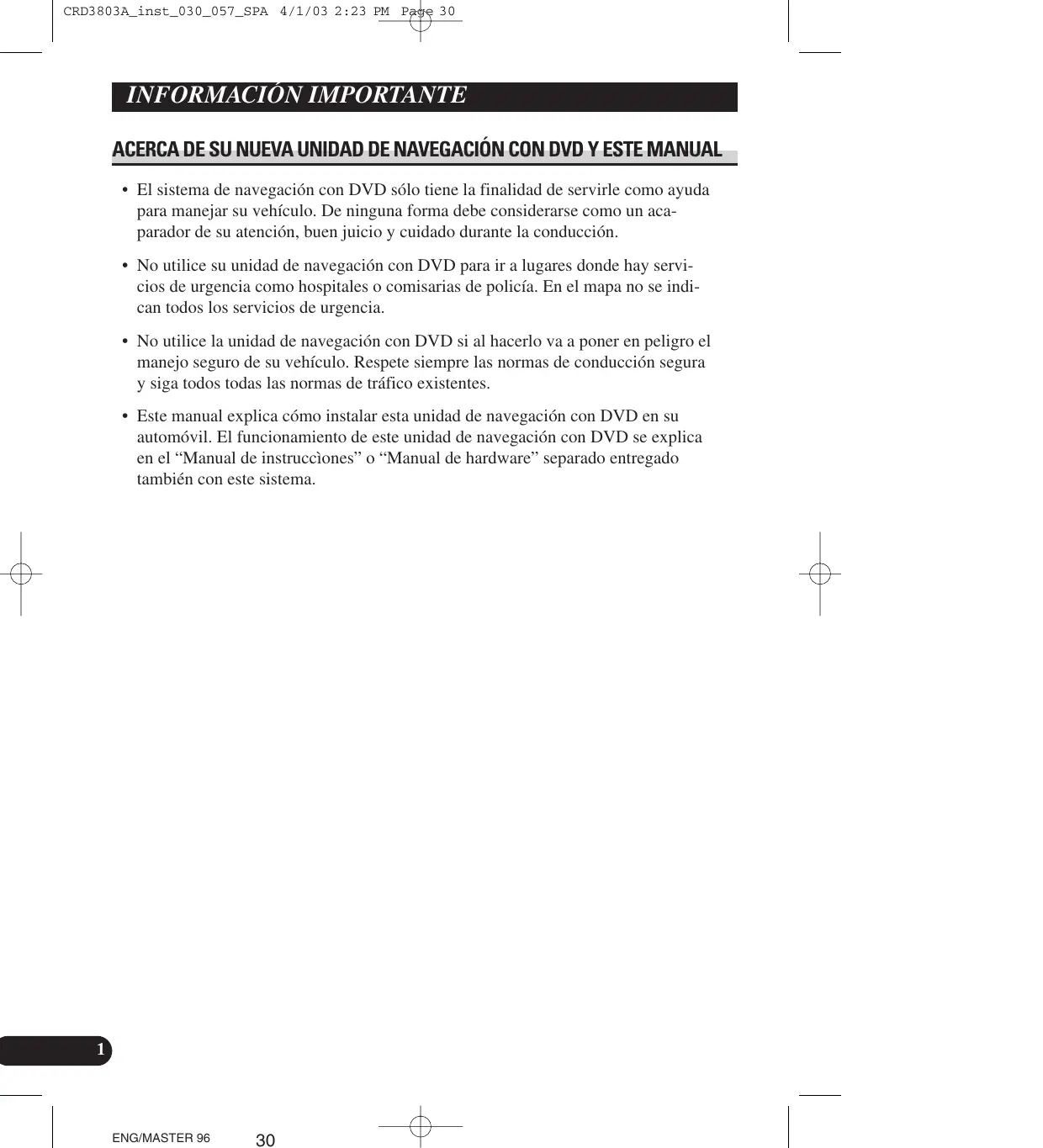 - Este manual explica cómo instalar esta unidad de navegación con DVD en su automóvil. El funcionamiento de este unidad de navegación con DVD se explica en el “Manual de instruccìones” o “Manual de hardware” separado entregado también con este sistema.