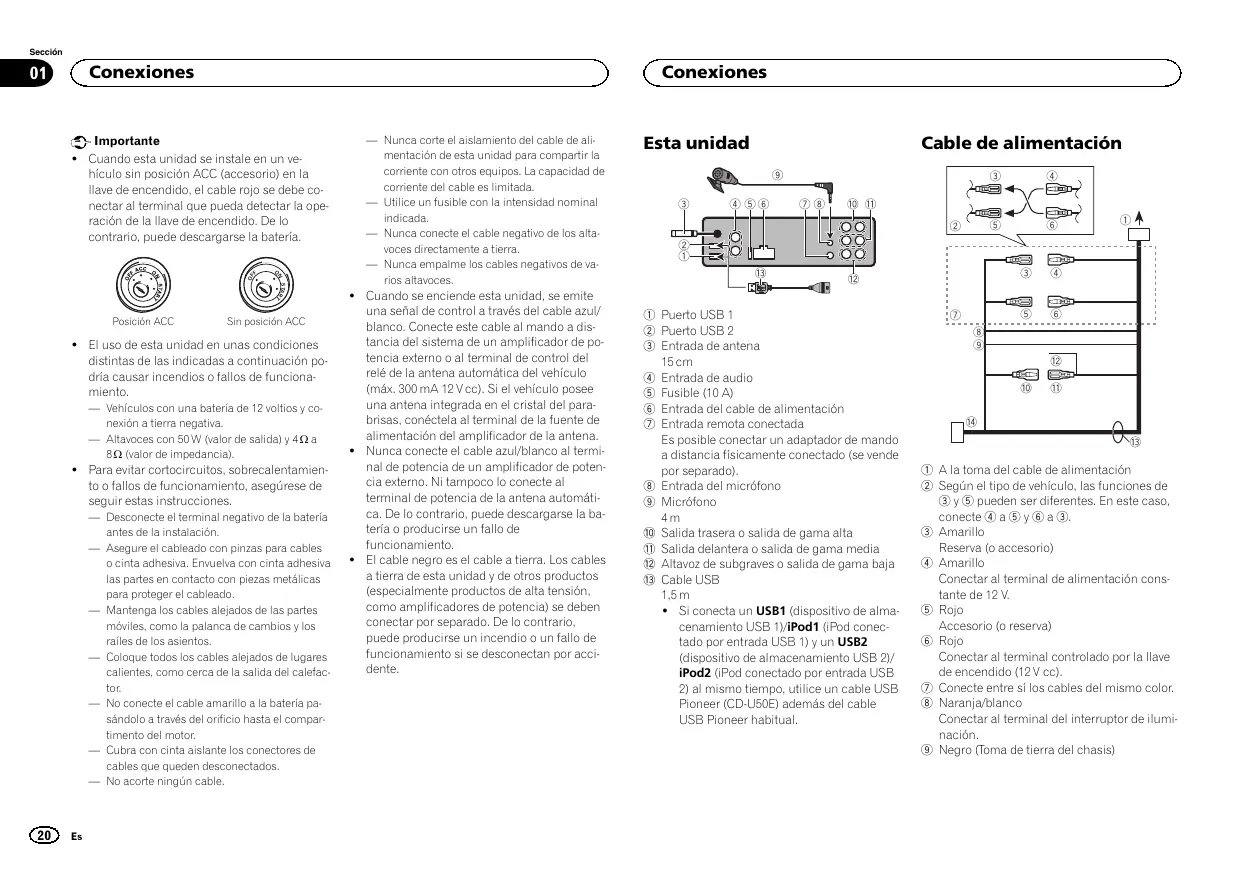4 Salida trasera o salida de gama alta D Salida delantera o salida de gama media #2 Altavoz de subgraves o salida de gara baja #3 Cable USB 15m + Si conecta un USB (dispositivo de alma- cenamiento USB 1)Podf (iPod conec tado por entrada USB 1) y un USB2 (dispositivo de almacenamiento USB 2) iPod2 (iPod conectado por entrada USB