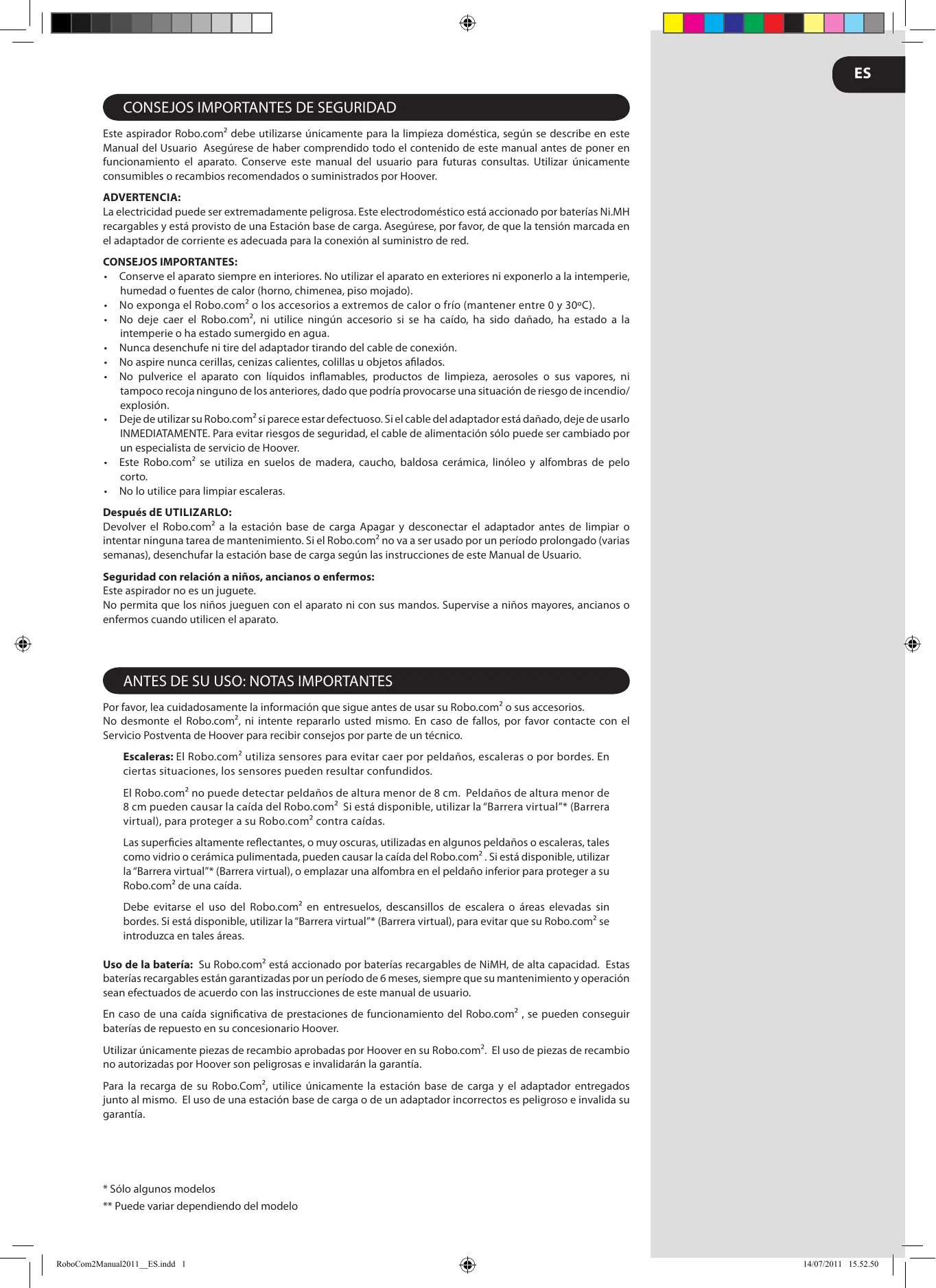 Por favor, lea cuidadosamente la información que sigue antes de usar su Robo.com² o sus accesorios. No desmonte el Robo.com², ni intente repararlo usted mismo. En caso de fallos, por favor contacte con el Servicio Postventa de Hoover para recibir consejos por parte de un técnico. Escaleras: El Robo.com² utiliza sensores para evitar caer por peldaños, escaleras o por bordes. En ciertas situaciones, los sensores pueden resultar confundidos. El Robo.com² no puede detectar peldaños de altura menor de 8 cm. Peldaños de altura menor de 8 cm pueden causar la caída del Robo.com² Si está disponible, utilizar la “Barrera virtual”* (Barrera virtual), para proteger a su Robo.com² contra caídas. Las superficies altamente reflectantes, o muy oscuras, utilizadas en algunos peldaños o escaleras, tales como vidrio o cerámica pulimentada, pueden causar la caída del Robo.com² . Si está disponible, utilizar la “Barrera virtual”* (Barrera virtual), o emplazar una alfombra en el peldaño inferior para proteger a su Robo.com² de una caída. Debe evitarse el uso del Robo.com² en entresuelos, descansillos de escalera o áreas elevadas sin bordes. Si está disponible, utilizar la “Barrera virtual”* (Barrera virtual), para evitar que su Robo.com² se introduzca en tales áreas. Uso de la batería: Su Robo.com² está accionado por baterías recargables de NiMH, de alta capacidad. Estas baterías recargables están garantizadas por un período de 6 meses, siempre que su mantenimiento y operación sean efectuados de acuerdo con las instrucciones de este manual de usuario. En caso de una caída significativa de prestaciones de funcionamiento del Robo.com² , se pueden conseguir baterías de repuesto en su concesionario Hoover. Utilizar únicamente piezas de recambio aprobadas por Hoover en su Robo.com². El uso de piezas de recambio no autorizadas por Hoover son peligrosas e invalidarán la garantía. Para la recarga de su Robo.Com², utilice únicamente la estación base de carga y el adaptador entregados junto al mismo. El uso de una estación base de carga o de un adaptador incorrectos es peligroso e invalida su garantía.