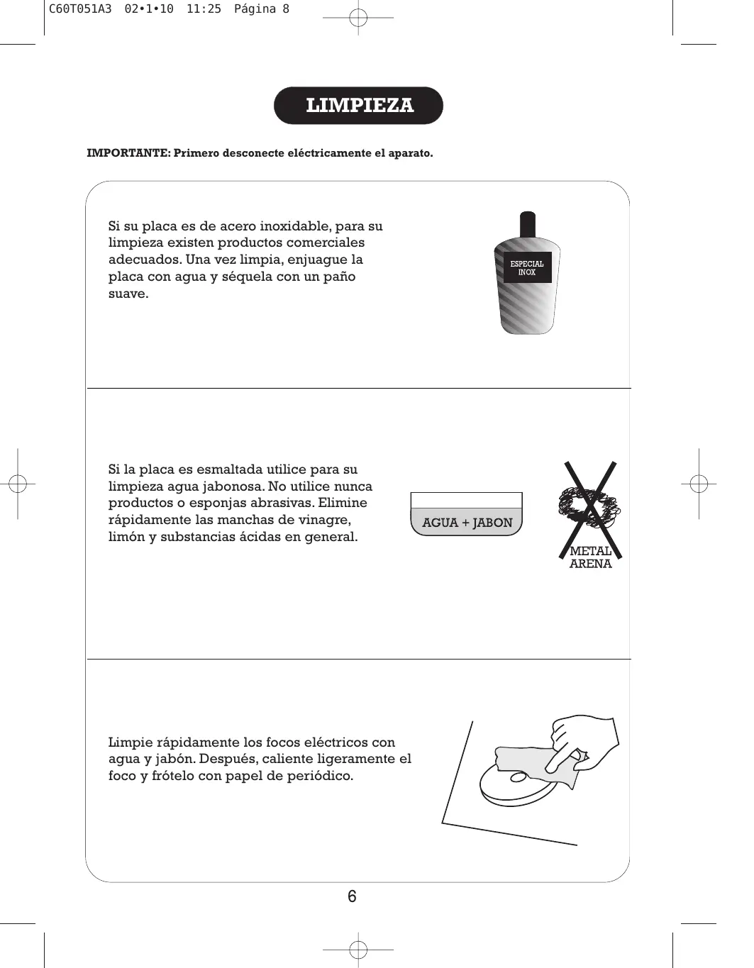 Si la placas es esmaltada utilise para su limpieza agua jabonosa. No utilise nunca produits o esponjas abrasivas. Elimine rápidamente las manchas de vinagre, limón y substancias ácidas en general.