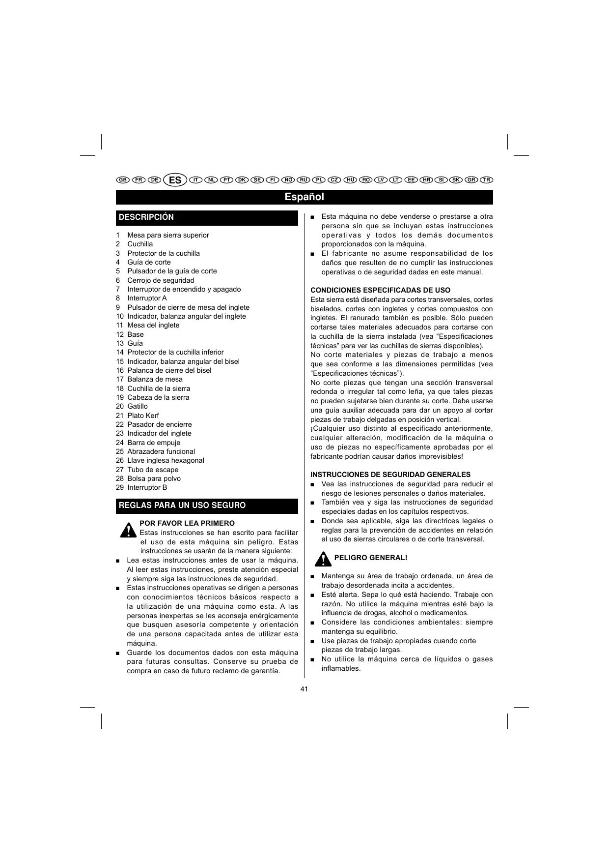 No corte materiales y piezas de trabajo a menos que sea conforme a las dimensiones permitidas (vea “Especificaciones técnicas”). No corte piezas que tengan una sección transversal redonda o irregular tal como leña, ya que tales piezas no pueden sujetarse bien durante su corte. Debe usarse una guía auxiliar adecuada para dar un apoyo al cortar piezas de trabajo delgadas en posición vertical. ¡Cualquier uso distinto al especificado anteriormente, cualquier alteración, modificación de la máquina o uso de piezas no específicamente aprobadas por el fabricante podrían causar daños imprevisibles! INSTRUCCIONES DE SEGURIDAD GENERALES ■ Vea las instrucciones de seguridad para reducir el riesgo de lesiones personales o daños materiales. ■ También vea y siga las instrucciones de seguridad especiales dadas en los capítulos respectivos. ■ Donde sea aplicable, siga las directrices legales o reglas para la prevención de accidentes en relación al uso de sierras circulares o de corte transversal.