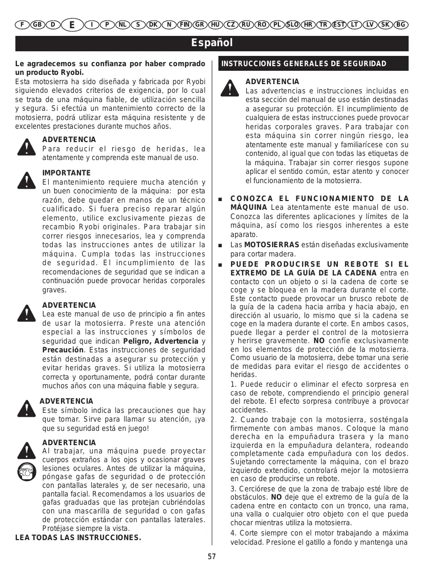Es imprescindible que lea las instrucciones de este manual antes del montaje y de la puesta en servicio. Attenzione! Español Le agradecemos su confianza por haber comprado un producto Ryobi. Esta motosierra ha sido diseñada y fabricada por Ryobi siguiendo elevados criterios de exigencia, por lo cual se trata de una máquina fiable, de utilización sencilla y segura. Si efectúa un mantenimiento correcto de la motosierra, podrá utilizar esta máquina resistente y de excelentes prestaciones durante muchos años.