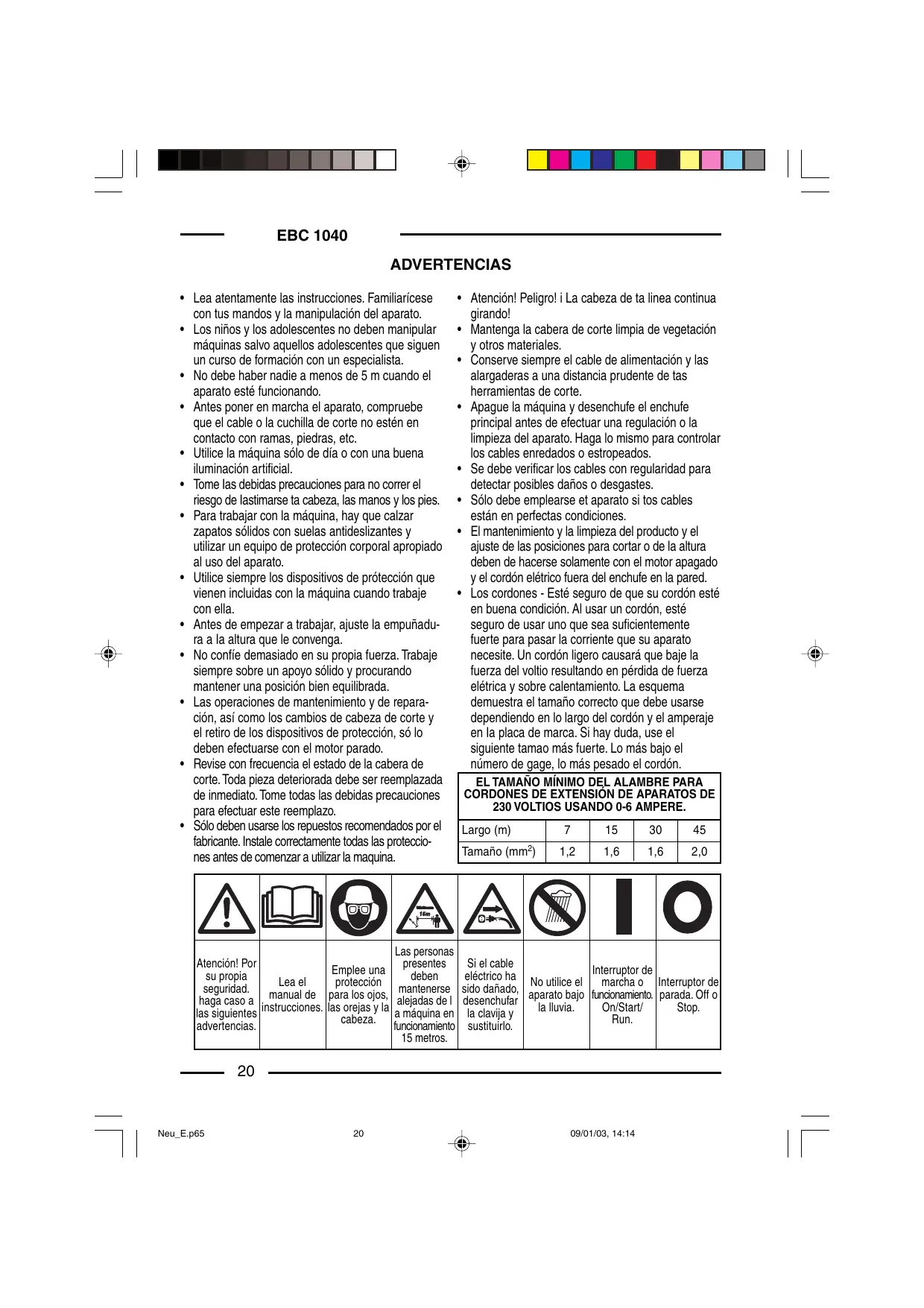 • Mantenga la cabera de corte limpia de vegetación y otros materiales. • Conserve siempre el cable de alimentación y las alargaderas a una distancia prudente de tas herramientas de corte. • Apague la máquina y desenchufe el enchufe principal antes de efectuar una regulación o la limpieza del aparato. Haga lo mismo para controlar los cables enredados o estropeados. • Se debe verificar los cables con regularidad para detectar posibles daños o desgastes. • Sólo debe emplearse et aparato si tos cables están en perfectas condiciones. • El mantenimiento y la limpieza del producto y el ajuste de las posiciones para cortar o de la altura deben de hacerse solamente con el motor apagado y el cordón elétrico fuera del enchufe en la pared. • Los cordones - Esté seguro de que su cordón esté en buena condición. Al usar un cordón, esté seguro de usar uno que sea suficientemente fuerte para pasar la corriente que su aparato necesite. Un cordón ligero causará que baje la fuerza del voltio resultando en pérdida de fuerza elétrica y sobre calentamiento. La esquema demuestra el tamaño correcto que debe usarse dependiendo en lo largo del cordón y el amperaje en Ia placa de marca. Si hay duda, use el siguiente tamao más fuerte. Lo más bajo el número de gage, lo más pesado el cordón. EL TAMAÑO MÍNIMO DEL ALAMBRE PARA CORDONES DE EXTENSIÓN DE APARATOS DE 230 VOLTIOS USANDO 0-6 AMPERE. Largo (m) Tamaño (mm2)