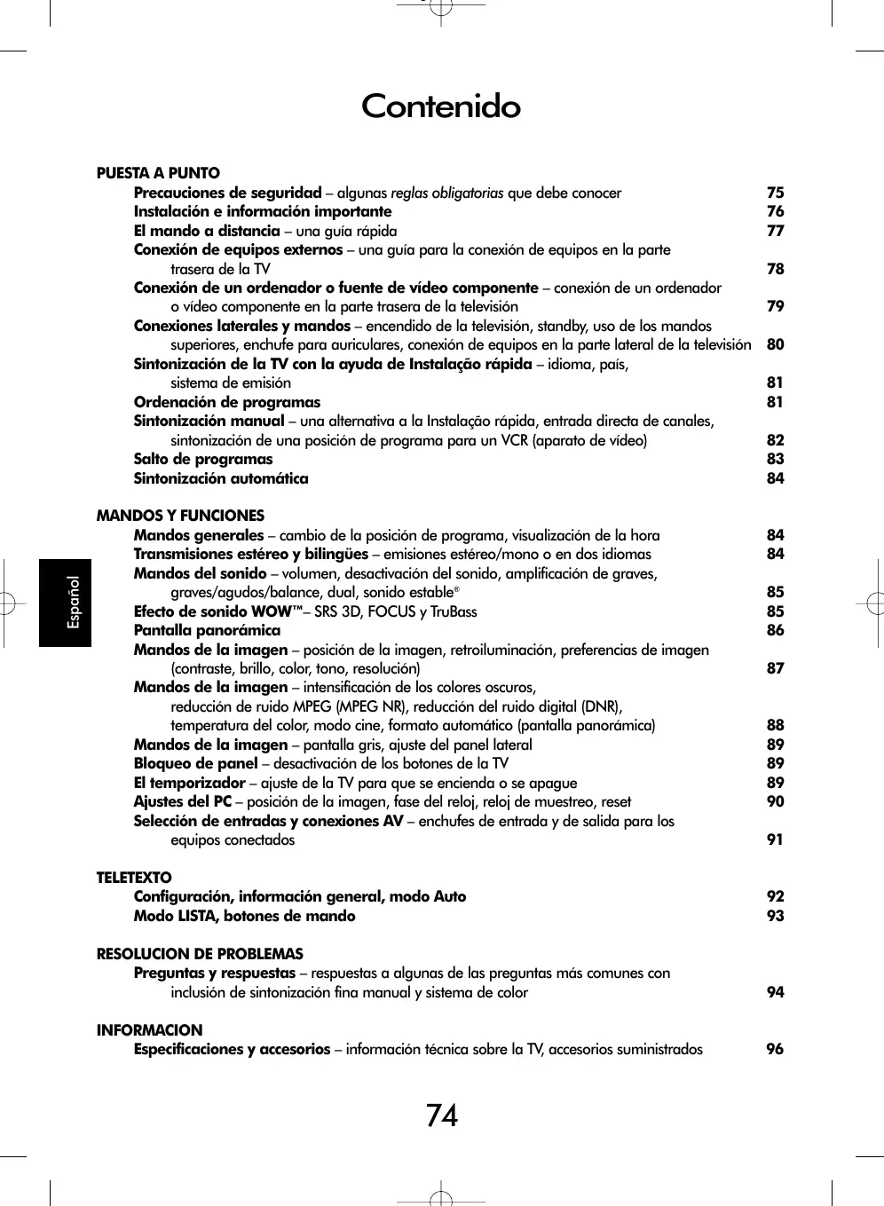 Instalación e información importante El mando a distancia – una guía rápida Conexión de equipos externos – una guía para la conexión de equipos en la parte trasera de la TV Conexión de un ordenador o fuente de vídeo componente – conexión de un ordenador o vídeo componente en la parte trasera de la televisión Conexiones laterales y mandos – encendido de la televisión, standby, uso de los mandos superiores, enchufe para auriculares, conexión de equipos en la parte lateral de la televisión Sintonización de la TV con la ayuda de Instalação rápida – idioma, país, sistema de emisión Ordenación de programas Sintonización manual – una alternativa a la Instalação rápida, entrada directa de canales, sintonización de una posición de programa para un VCR (aparato de vídeo) Salto de programas Sintonización automática MANDOS Y FUNCIONES Mandos generales – cambio de la posición de programa, visualización de la hora Transmisiones estéreo y bilingües – emisiones estéreo/mono o en dos idiomas Mandos del sonido – volumen, desactivación del sonido, amplificación de graves, graves/agudos/balance, dual, sonido estable® Efecto de sonido WOW™– SRS 3D, FOCUS y TruBass Pantalla panorámica Mandos de la imagen – posición de la imagen, retroiluminación, preferencias de imagen (contraste, brillo, color, tono, resolución) Mandos de la imagen – intensificación de los colores oscuros, reducción de ruido MPEG (MPEG NR), reducción del ruido digital (DNR), temperatura del color, modo cine, formato automático (pantalla panorámica) Mandos de la imagen – pantalla gris, ajuste del panel lateral Bloqueo de panel – desactivación de los botones de la TV El temporizador – ajuste de la TV para que se encienda o se apague Ajustes del PC – posición de la imagen, fase del reloj, reloj de muestreo, reset Selección de entradas y conexiones AV – enchufes de entrada y de salida para los equipos conectados