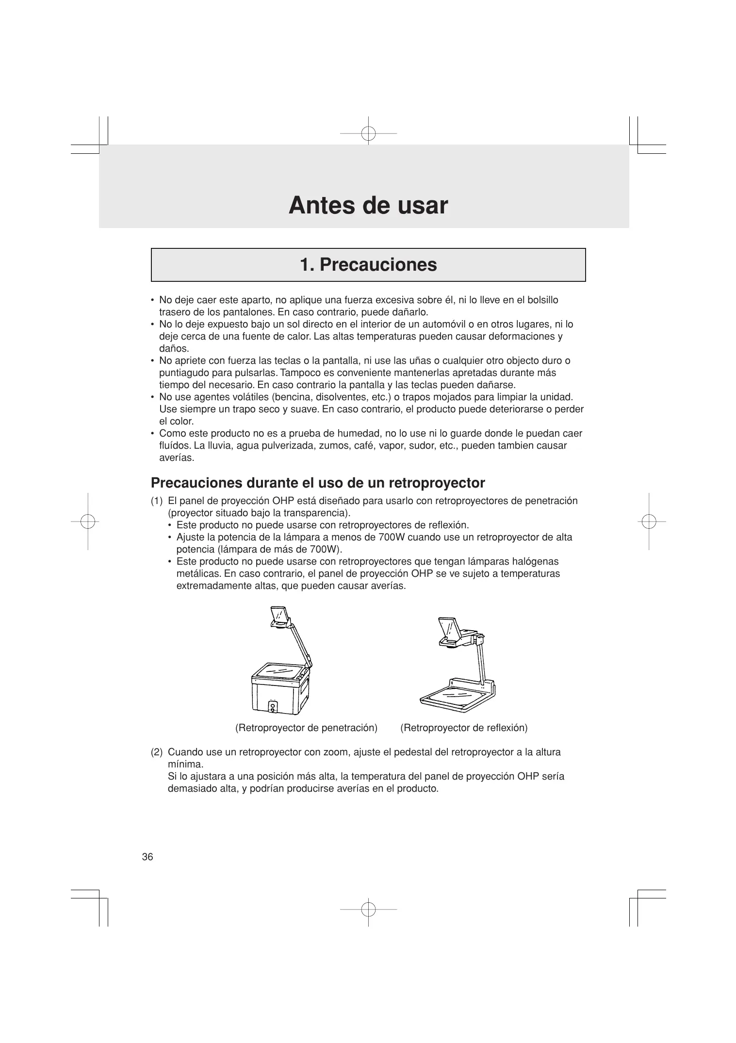 (1) El panel de proyección OHP está diseñado para usarlo con retroproyectores de penetración (proyector situado bajo la transparencia). • Este producto no puede usarse con retroproyectores de reflexión. • Ajuste la potencia de la lámpara a menos de 700W cuando use un retroproyector de alta potencia (lámpara de más de 700W). • Este producto no puede usarse con retroproyectores que tengan lámparas halógenas metálicas. En caso contrario, el panel de proyección OHP se ve sujeto a temperaturas extremadamente altas, que pueden causar averías.