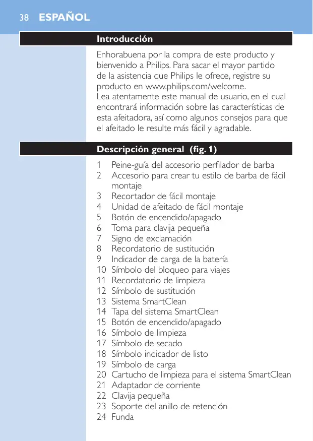 Antes de usar la afeitadora y el sistemas SmartClean, lea atentamente estemanual del usuario y conservelo por si necessitaradiscultarlo enel futuro.