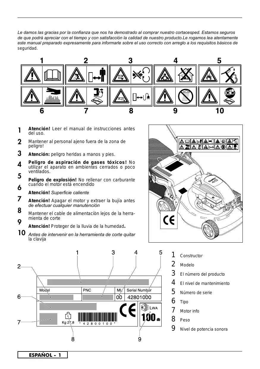 Le damos las gracias por la confianza que nos ha demostrado al comprar nuestro cortacesped. Estamos seguros de que podrá apreciar con el tiempo y con satisfacción la calidad de nuestro producto.Le rogamos lea atentamente este manual preparado expresamente para informarle sobre el uso correcto con arreglo a los requisitos básicos de seguridad.
