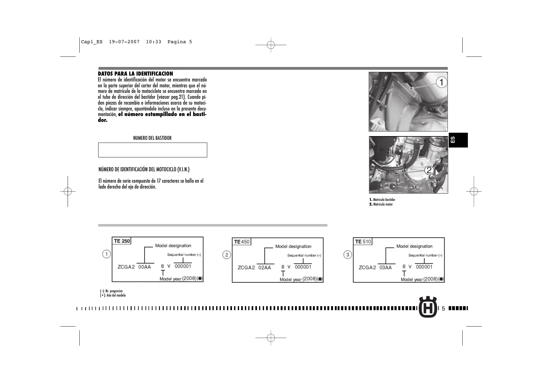 En la velocidad [TE 250) En la velocidad En la velocidad En la velocidad En la velocidad En la velocidad En 20 velocidad En 20 velocidad En 2a velocidad En 2a velocidad En 20 velocidad En 20 velocidad En 3a velocidad En 3a velocidad En 3a velocidad En 3a velocidad En 3a velocidad En 3a velocidad En 4a velocidad En 4a velocidad En 4a velocidad En 4a velocidad En 4a velocidad En 4a velocidad En 5a velocidad En 5a velocidad En 5a velocidad En 5a velocidad En 5a velocidad En 5a velocidad En 6a velocidad En 6a velocidad En 6a velocidad BASTIDOR Tipo….mono-raviesa con tubs de sen rcular,rectangular t elipsodal en acero;astidor tasero de alencôn igera SUSPENSION DELANTERA Tipe horqultelhiräuie de véstages vel al res y pero an gd noms singes 50 Care en dde pas, 300; NA] 50m SUSPENSION TRASERA TP. … progressive con monoamartiguador hiréulico Carrera de a rueda[TCTE) 236 mm Care del rueda SWR) 290 mm FO DELANTERO Tipo.. de disco fo dim. 260 mm (TE, TC “de disco fotate dim 320 mm (SUR de made iréuio, pinza tnt (ETC ben pra rad SHR) FRENO TRASERO Tipo… de ds tante 9240 mm de mando hidréulio y ina fltnte LLANTAS Delantera (TE, TC). TAKASAGO “Excel” in ga iger: 16x21" Delantera (SM SANREMO in gage: 3,50417° Trosera KASAGO ‘Excel in ga lgera: 2,518" Trasera (TC). TANASAGO “Excel” in ligaligera: 85x19" (250); 215419 (450.510) Trasera (SR) .SANREMO in ga lgera: 4,25417/T NEUMATICO Dearers (M. Michelin ENDURO COMP.3 o bien Pirelli MT 83 Scorpion: o bien Dunlop 54.D907.90/9021" (ro … el SAT SD, 80/1 ..Pirelli MTR 21 Dr I Trasero (TE).…….Michelin ENDURO COMP. 3 o bien Pirelli MT 83 Scorpion o bien Dunlop 70R-D907 120/90x18" (25 (SR. Piel TR 22 DRAGONLEVO; 50/6017" 10 1a/en 08:09 Kg/cm2 Prsin de inflado en fi delnter 1 Presiôn de inflado en ri (ser TO. LÉ} Presiôn de info en ro (dlanter #10? ] Presiô de iflado en rio frsero 04-09 Kg/cm2 +} Presién de inflodo en frio delantero TE)... 1 Kg/em? ] Presiôn de inflodo en rio à rasero TE) … … 0 Kg/em Pres deifiado en io elanero avant SUR)... 1,4kg/em2 Presiôn de inflado en frio fie [ovot MP... 18 Kg/em? sé on el poto Presiôn de inflado en Hrio delantero SUR) 2/0kg/em2 con el pilote yel poser :}Presiôn de inflado en frio ser SAR) kr "Pre Pres din de inflado en frio 6 kg/en? «2,0 Kg/en? él con el poto