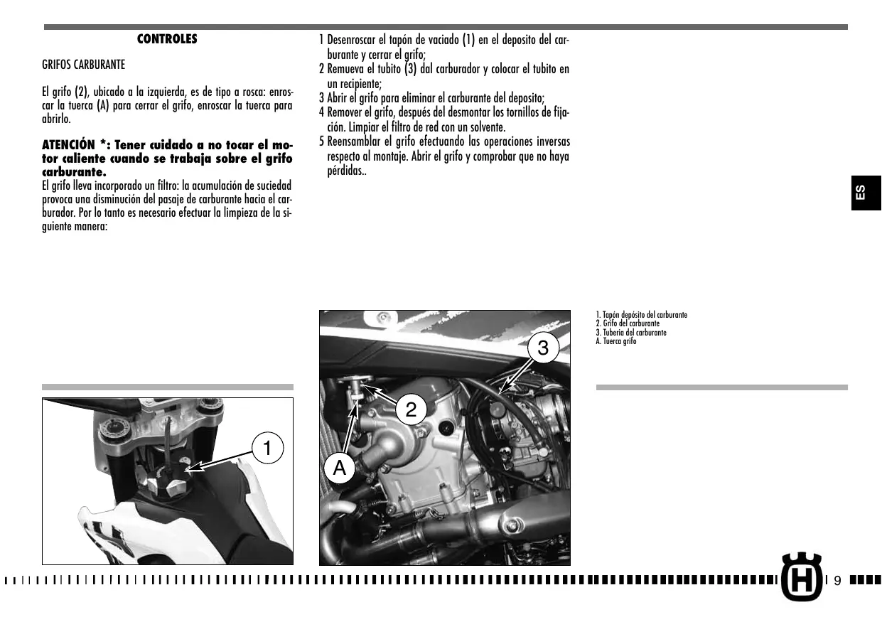 GRIFOS CARBURANTE El grifo (2), ubicado a la izquierda, es de tipo a rosca: enroscar la tuerca (A) para cerrar el grifo, enroscar la tuerca para abrirlo. ATENCIÓN *: Tener cuidado a no tocar el motor caliente cuando se trabaja sobre el grifo carburante. El grifo lleva incorporado un filtro: la acumulación de suciedad provoca una disminución del pasaje de carburante hacia el carburador. Por lo tanto es necesario efectuar la limpieza de la siguiente manera: 1 Desenroscar el tapón de vaciado (1) en el deposito del carburante y cerrar el grifo; 2 Remueva el tubito (3) dal carburador y colocar el tubito en un recipiente; 3 Abrir el grifo para eliminar el carburante del deposito; 4 Remover el grifo, después del desmontar los tornillos de fijación. Limpiar el filtro de red con un solvente. 5 Reensamblar el grifo efectuando las operaciones inversas respecto al montaje. Abrir el grifo y comprobar que no haya pérdidas..