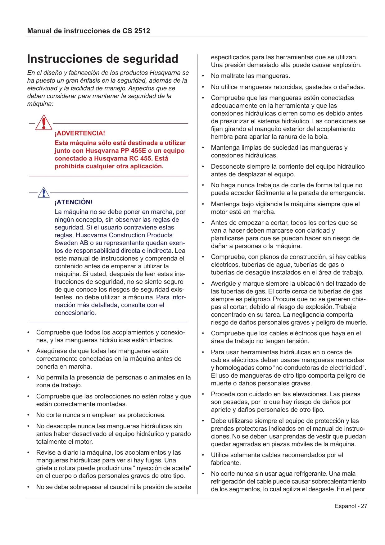 Manual de instrucciones de CS 2512 Instrucciones de seguridad En el diseño y fabricación de los productos Husqvarna se ha puesto un gran énfasis en la seguridad, además de la efectividad y la facilidad de manejo. Aspectos que se deben considerar para mantener la seguridad de la máquina: especificados para las herramientas que se utilizan. Una presión demasiado alta puede causar explosión.