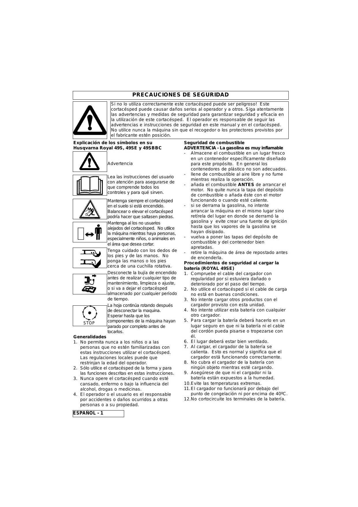 Si no lo utiliza correctamente este cortacésped puede ser peligroso! Este cortacésped puede causar daños serios al operador y a otros. Siga atentamente las advertencias y medidas de seguridad para garantizar seguridad y eficacia en la utilización de este cortacésped. El operador es responsable de seguir las advertencias e instrucciones de seguridad en este manual y en el cortacésped. No utilice nunca la máquina sin que el recogedor o los protectores provistos por el fabricante estén posición. Explicación de los símbolos en su Husqvarna Royal 49S, 49SE y 49SBBC Advertencia Lea las instrucciones del usuario con atención para asegurarse de que comprende todos los controles y para qué sirven. Mantenga siempre el cortacésped en el suelo si está encendido. Balancear o elevar el cortacésped podría hacer que saltasen piedras. Mantenga al los no usuarios alejados del cortacésped. No utilice la máquina mientras haya personas, especialmente niños, o animales en el área que desea cortar. Tenga cuidado con los dedos de los pies y de las manos. No ponga las manos o los pies cerca de una cuchilla rotativa. Desconecte la bujía de encendido antes de realizar cualquier tipo de mantenimiento, limpieza o ajuste, o si va a dejar el cortacésped almacenado por cualquier período de tiempo. STOP La hoja continúa rotando después de desconectar la maquina. Esperar hasta que los componentes de la máquina hayan parado por completo antes de tocarlos. Generalidades