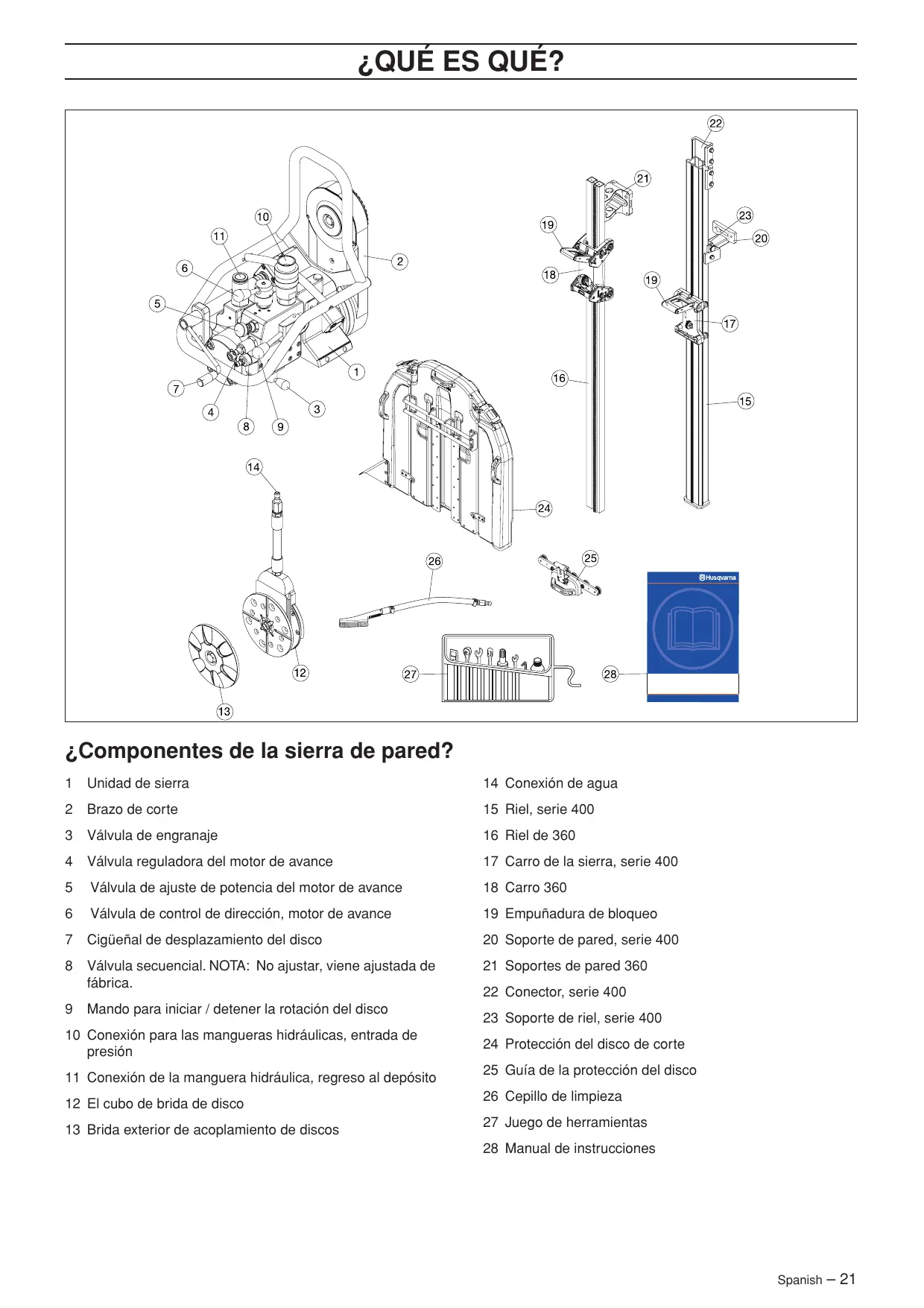 Mando para iniciar / detener la rotación del disco 10 Conexión para las mangueras hidráulicas, entrada de presión 11 Conexión de la manguera hidráulica, regreso al depósito 12 El cubo de brida de disco 13 Brida exterior de acoplamiento de discos 22 Conector, serie 400 23 Soporte de riel, serie 400 24 Protección del disco de corte 25 Guía de la protección del disco 26 Cepillo de limpieza 27 Juego de herramientas 28 Manual de instrucciones Spanish – 21