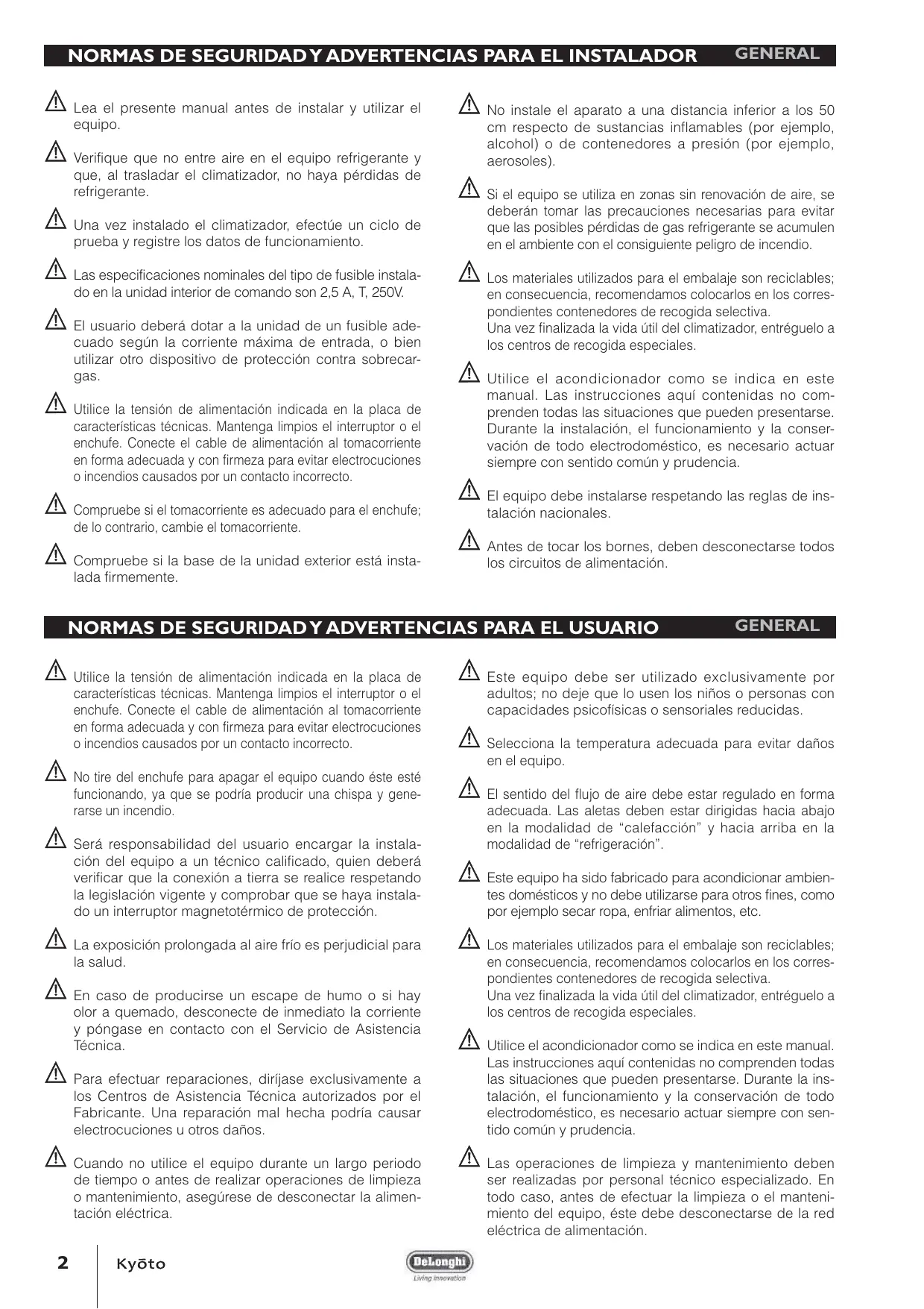 KYOTO - Acondicionador de aire DELONGHI - Manual de uso y guía de instrucciones gratis