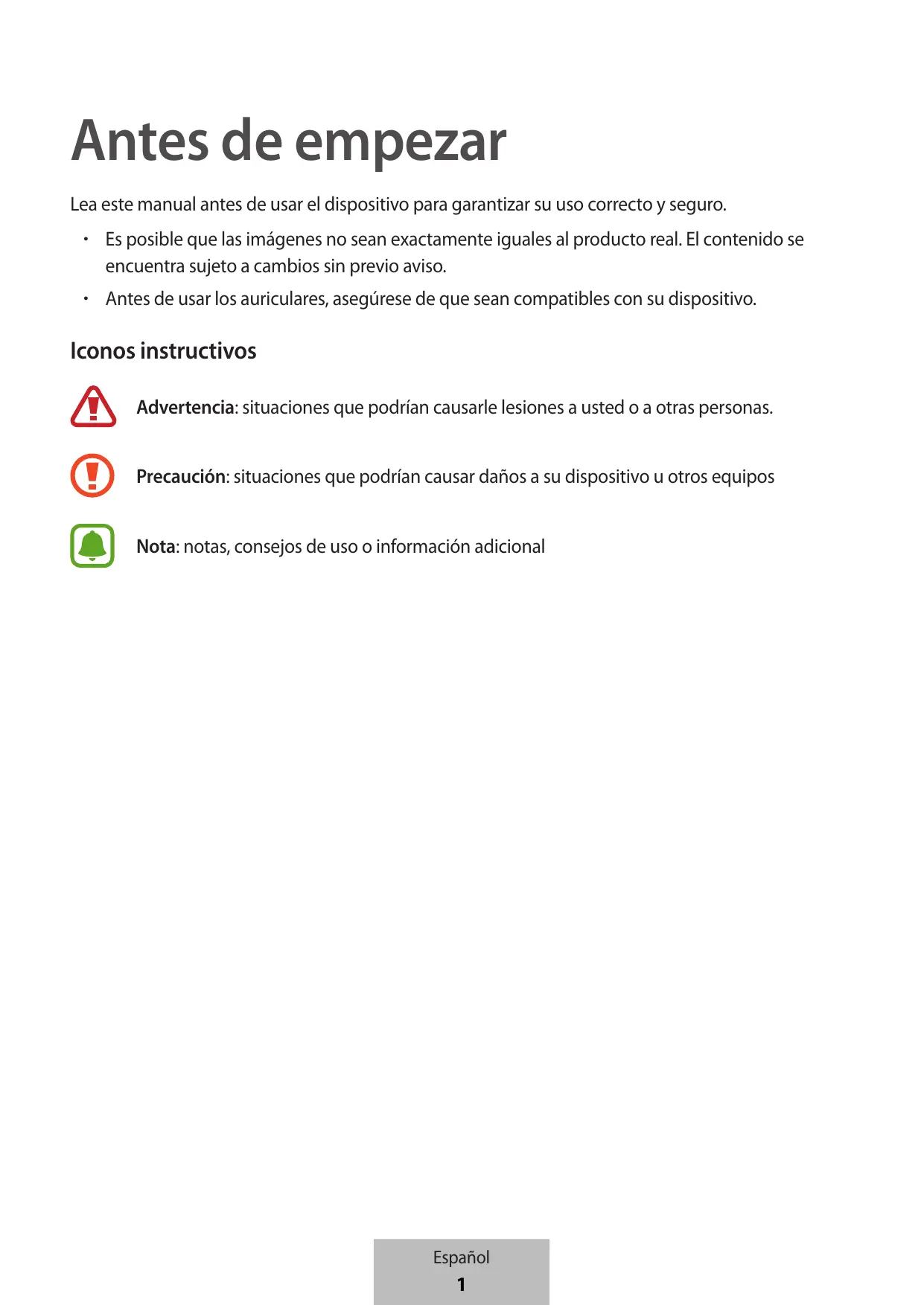 - Antes de usar los auriculares, asegúrese de que sean compatibles con su dispositivo. Iconos instructivos Advertencia: situaciones que podrían causarle lesiones a usted o a otras personas. Precaución: situaciones que podrían causar daños a su dispositivo u otros equipos Nota: notas, consejos de uso o información adicional Español