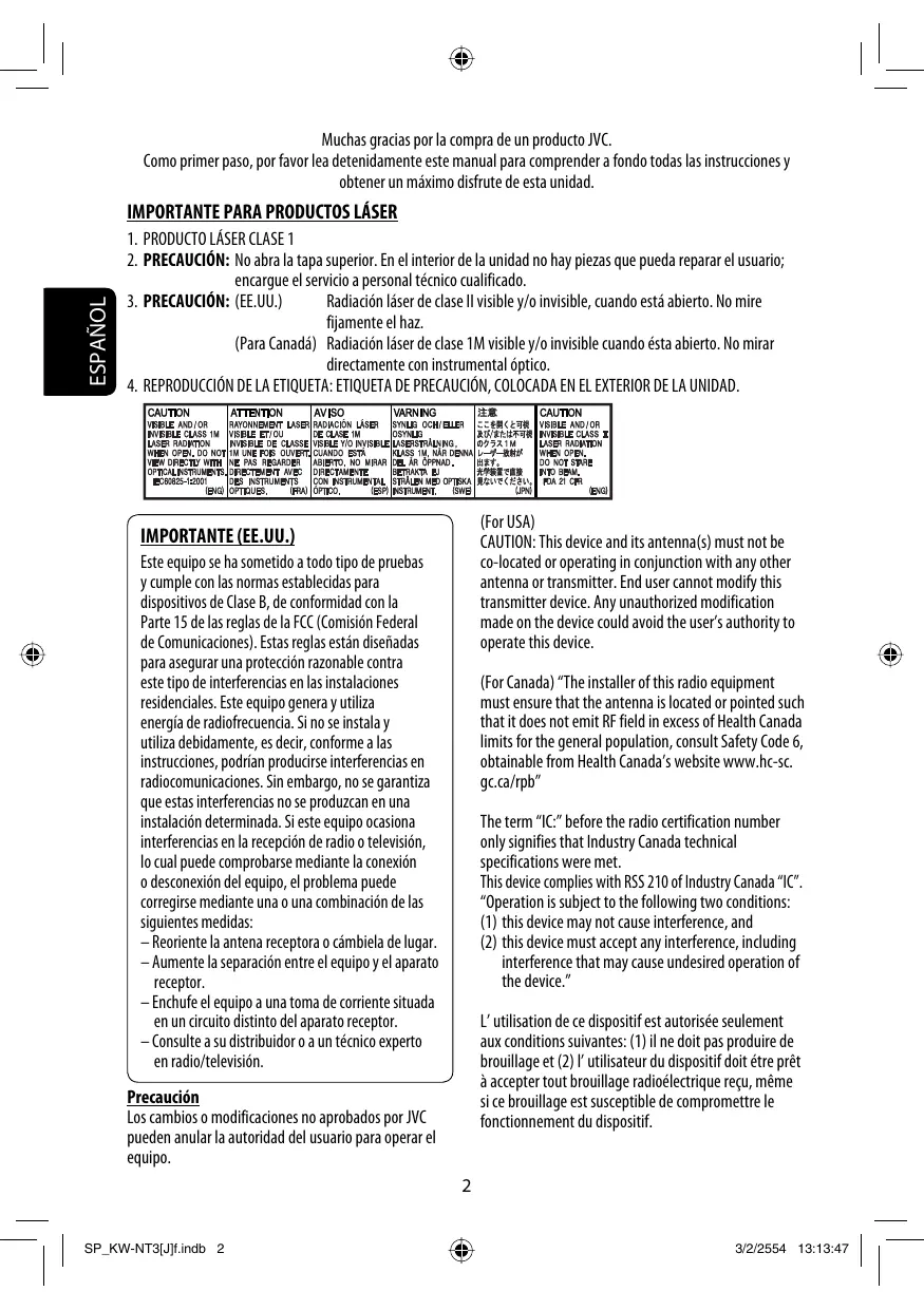 ESPAÑOL HD Radio Traffic is available only for KW-NT50HDT. HD Radio Traffic se encuentra disponible sólo con el KW-NT50HDT. HD Radio Traffic est disponible uniquement pour le KW-NT50HDT. Fix the reception mode either to <Digital> or <Analog>. (☞ page 46) Muchas gracias por la compra de un producto JVC. Como primer paso, por favor lea detenidamente este manual para comprender a fondo todas las instrucciones y obtener un máximo disfrute de esta unidad. ESPAÑOL
