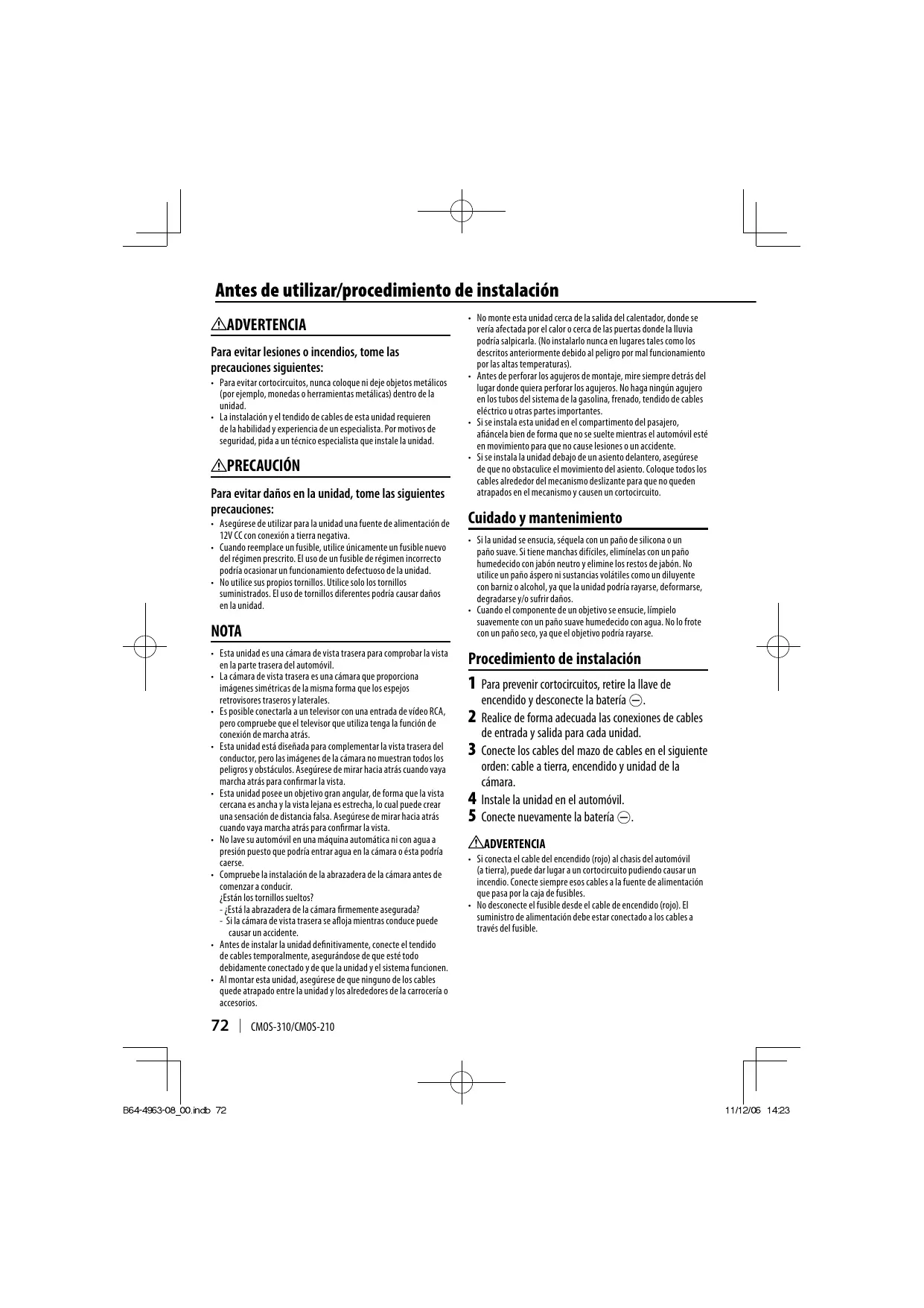 Antes de utilizar/procedimiento de instalación ADVERTENCIA Para evitar lesiones o incendios, tome las precauciones siguientes: • Para evitar cortocircuitos, nunca coloque ni deje objetos metálicos (por ejemplo, monedas o herramientas metálicas) dentro de la unidad. • La instalación y el tendido de cables de esta unidad requieren de la habilidad y experiencia de un especialista. Por motivos de seguridad, pida a un técnico especialista que instale la unidad.