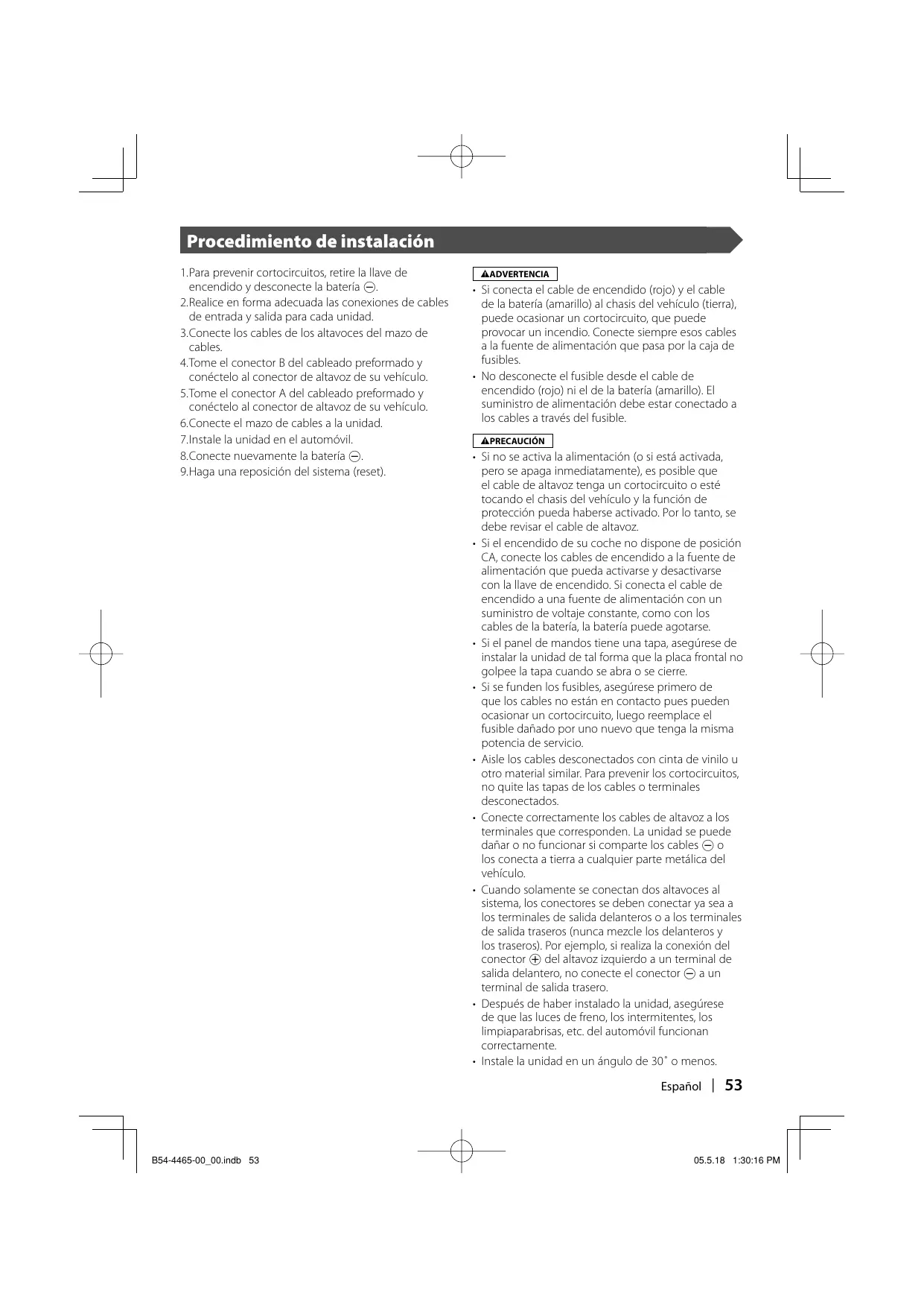 Procedimiento de instalaciôn 1.Para prevenir cortocircuitos, retire la Ilave de encendido y desconecte la bateria ©) 2.Realice en forma adecuada las conexiones de cables de entrada y salida para cada unidad. 3.Conecte los cables de los altavoces del mazo de cables. 4Tome el conector B del cableado preformado y conéctelo al conector de altavoz de su vehiculo. 5.Tome el conector À del cableado preformado y conéctelo al conector de altavoz de su vehiculo. 6.Conecte el mazo de cables a la unidad! 7.nstale la unidad en el automévil. 8.Conecte nuevamente la bateria ©) 9.Haga una reposiciôn del sistema (reset) + Si conecta el cable de encendido {rojo) y el cable de la bateria (amarillo) al chasis del vehiculo (tierra), puede ocasionar un cortocircuito, que puede provocar un incendio. Conecte siempre esos cables à la fuente de alimentacién que pasa por la caja de fusibles + No desconecte el fusible desde el cable de encendido (roje) ni el de la bateria (amarillo). El suministro de alimentaciôn debe estar conectado à los cables a través del fusible. + Sino se activa la alimentaciôn (o si esté activada, pero se apaga inmediatemente) es posible que el cable de altavz tenga un cortocircuito o esté tocando el chasis del vehiculo y la funcién de protecciôn pueda haberse activado. Por lo tanto, se debe revisar el cable de altavoz. Si el encendido de su coche no dispone de posiciôn CA, conecte los cables de encendido a la fuente de limentacién que pueda activarse y desactivarse con la llave de encendido. Si conecta el cable de encendido a una fuente de alimentacién con un suministro de voltaje constante, como con los cables de la bateria, la bateria puede agotarse. Si el panel de mandos tiene una tapa, asegürese de instaler la unidad de tal forma que la placa frontal no golpee la tapa cuando se abra o se cierre. Si se funden los fusibles, asegürese primero de que los cables no estän en contacto pues pueden ocasionar un cortocircuito, luego reemplace el fusible dañado por uno nuevo que tenga la misma potencia de servicio. Aïsle los cables desconectados con cinta de vinilo u otro material similar. Para prevenir los cortocircuitos, no quite las tapas de los cables o terminales desconectados Conecte correctamente los cables de altavoz a los terminales que corresponden. La unidad se puede dañar o no funcionar si comparte los cables © o los conecta a tierra a cualquier parte metélica del vehiculo. Cuando solamente se conectan dos altavoces al sistema, los conectores se deben conectar ya sea à los terminales de salida delanteros o a los terminales de salida traseros (nunca mezcle los delanteros y los traseros). Por ejemplo, si realiza la conexiôn del conector ® del altavez izquierdo a un terminal de salida delantero, no conecte el conector © à un terminal de salida trasero. Después de haber instalado la unidad, asegurese de que las luces de freno, los intermitentes, los limpiaparabrisas, etc. del automévil funcionan correctamente. + Instale la unidad en un éngulo de 30° o menos. Español | 53