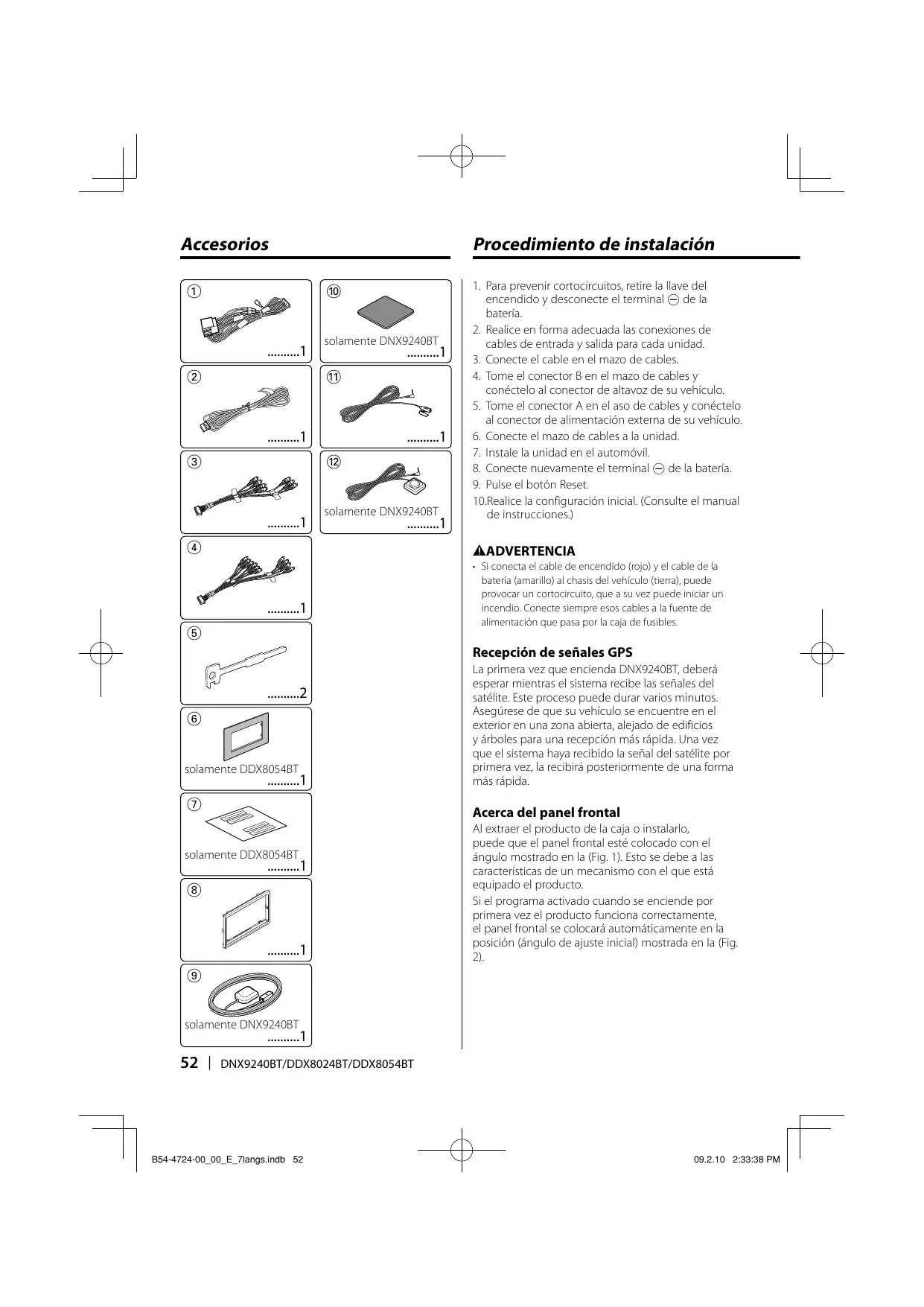 - Si conecta el cable de encendido (rojo) y el cable de la batería (amarillo) al chasis del vehículo (tierra), puede provocar un cortocircuito, que a su vez puede iniciar un incendio. Conecte siempre esos cables a la fuente de alimentación que pasa por la caja de fusibles. Recepción de señales GPS La primera vez que encienda DNX9240BT, deberá esperar mientras el sistema recibe las señales del satélite. Este proceso puede durar varios minutos. Asegúrese de que su vehículo se encuentre en el exterior en una zona abierta, alejado de edificios y árboles para una recepción más rápida. Una vez que el sistema haya recibido la señal del satélite por primera vez, la recibirá posteriormente de una forma más rápida. Acerca del panel frontal Al extraer el producto de la caja o instalarlo, puede que el panel frontal esté colocado con el ángulo mostrado en la (Fig. 1). Esto se debe a las características de un mecanismo con el que está equipado el producto. Si el programa activado cuando se enciende por primera vez el producto funciona correctamente, el panel frontal se colocará automáticamente en la posición (ángulo de ajuste inicial) mostrada en la (Fig. 2). Después de la instalación Después de la instalación, realice la configuración inicial siguiendo el manual de instrucciones.